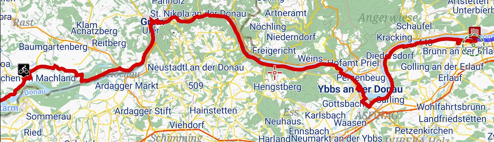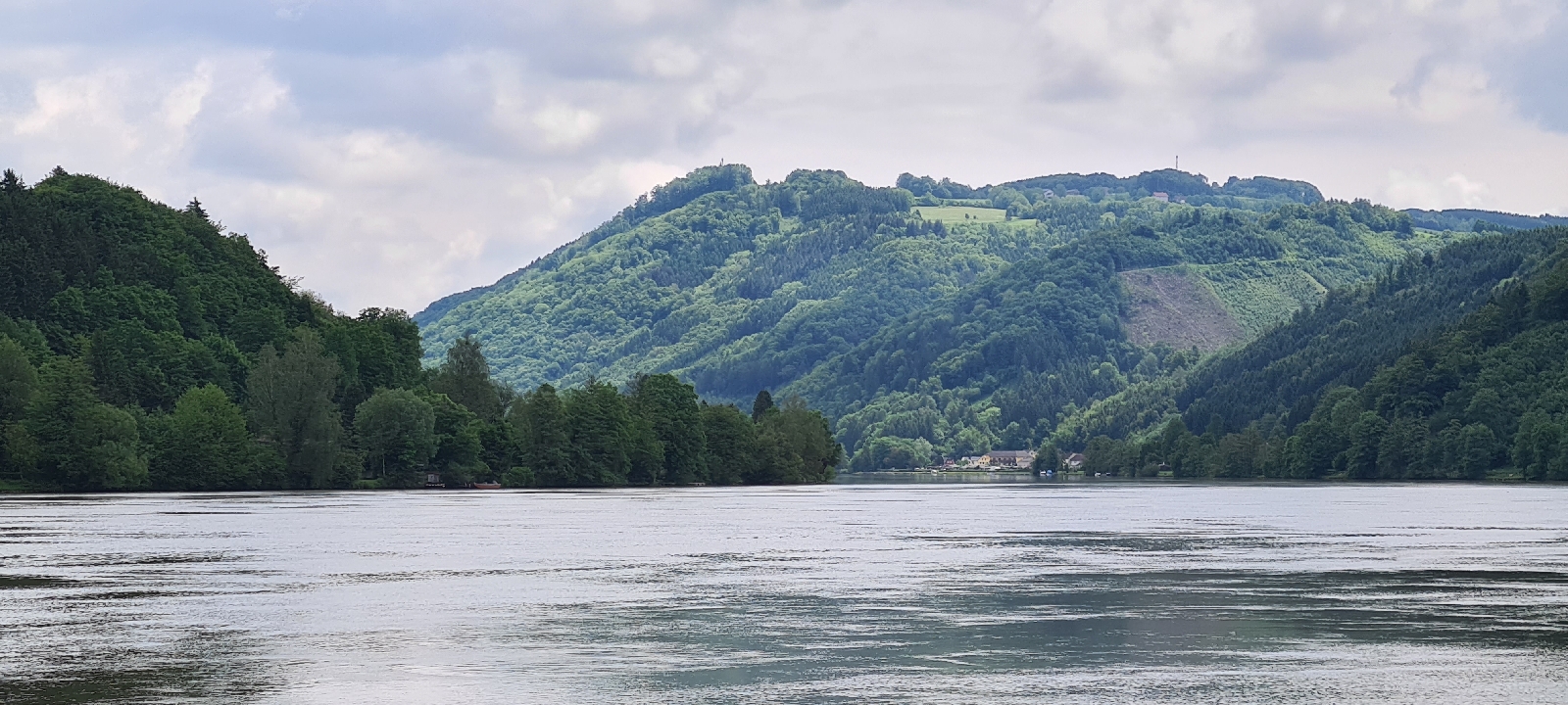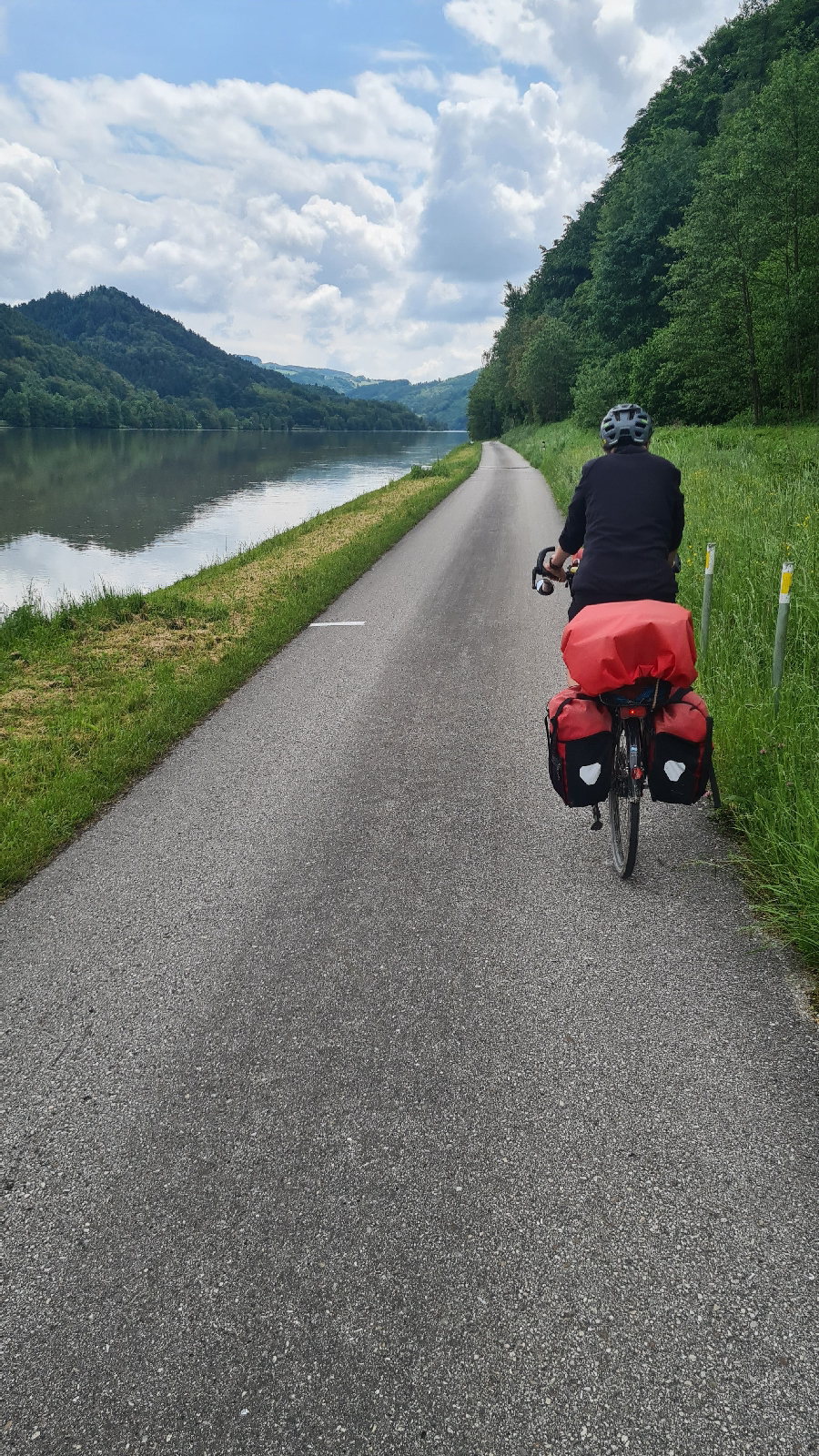 Erstmal radeln wir ziemlich weit weg von der Donau, sehen sie erst nach 5 Kilometern. Dann bis Grein direkt am Ufer lang, sehr schöner Weg. Kurz vor Grein ein kurzes steiles Stück