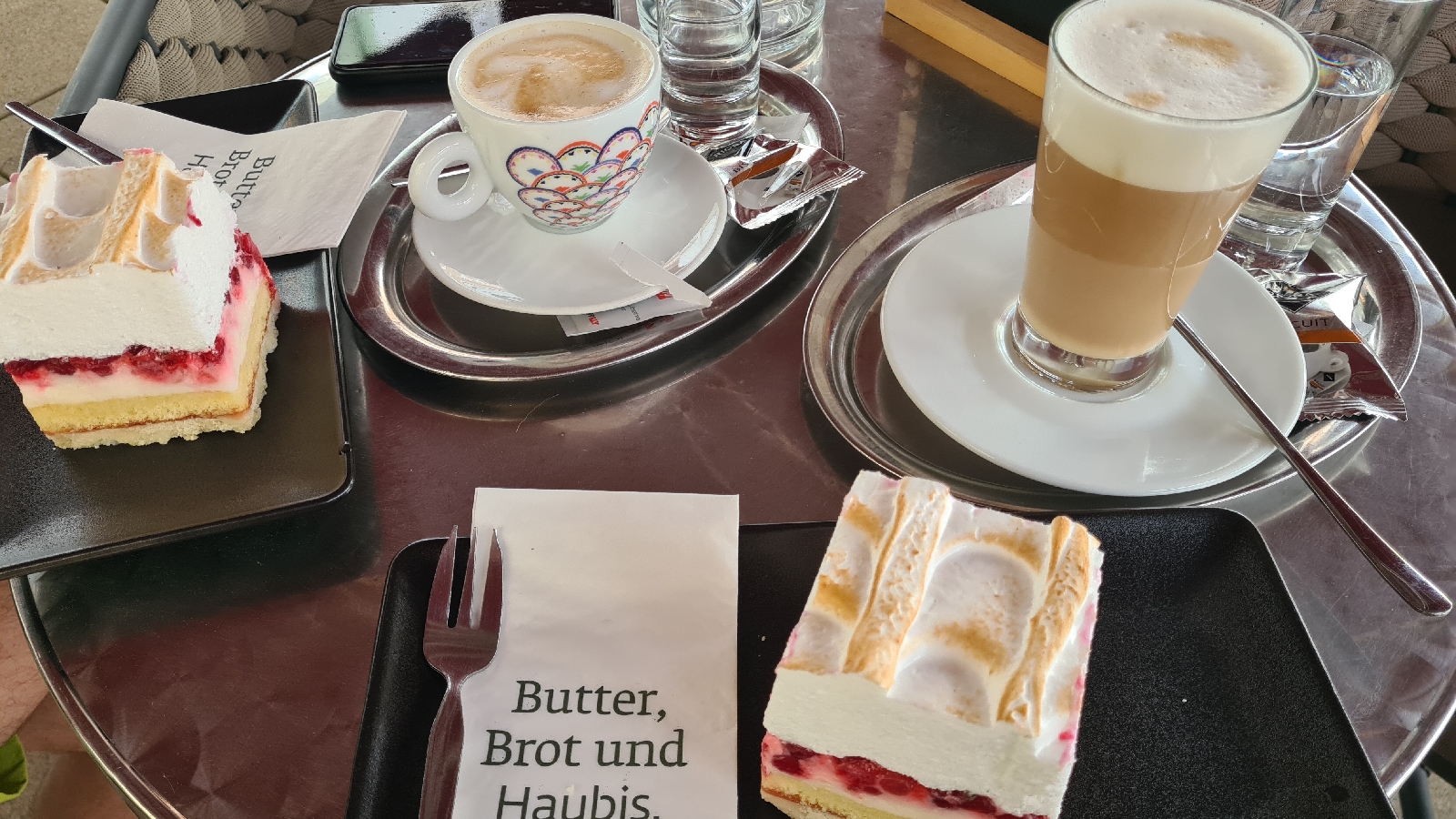 Zum Tourabschlus einen Latte mit Hafermilch (!!), einen Cappuccino und je eine Ribiselschnitte – lecker und extrem kalorienarm!