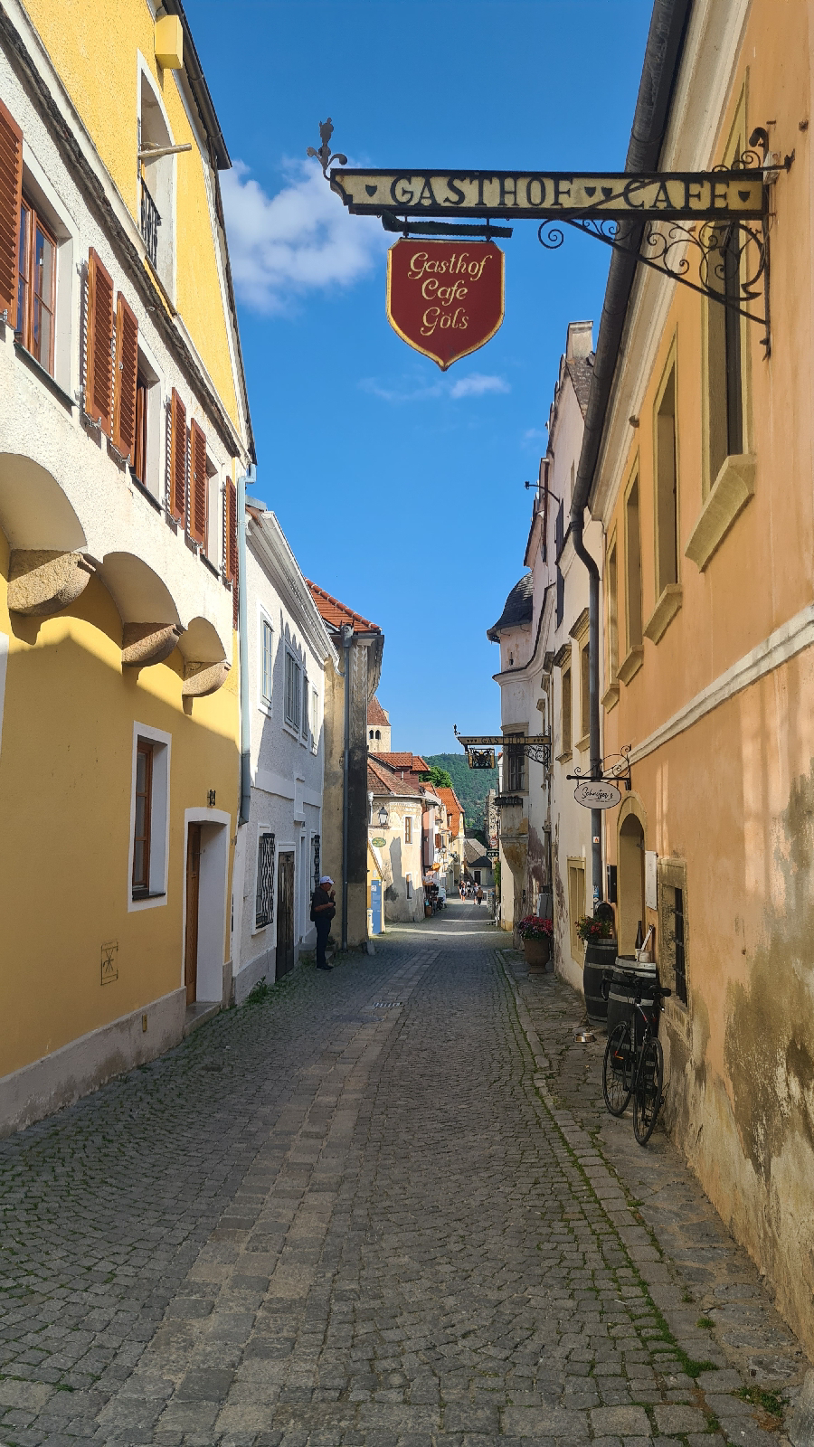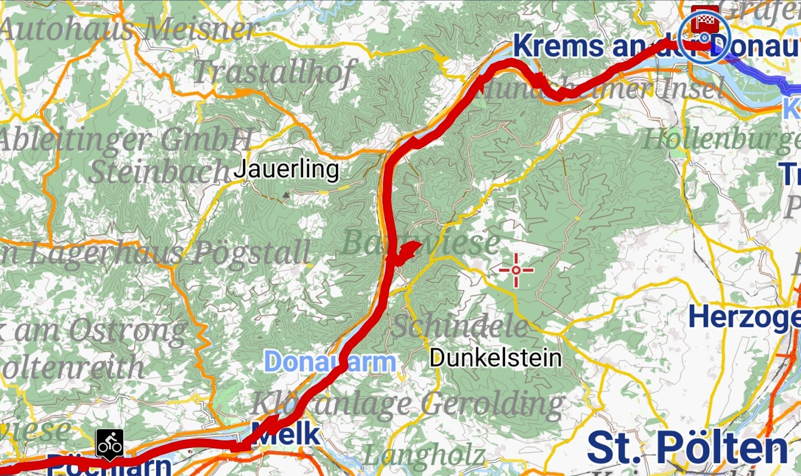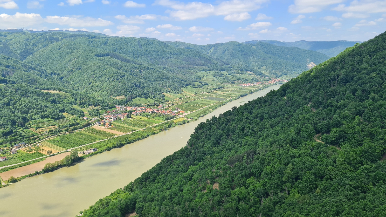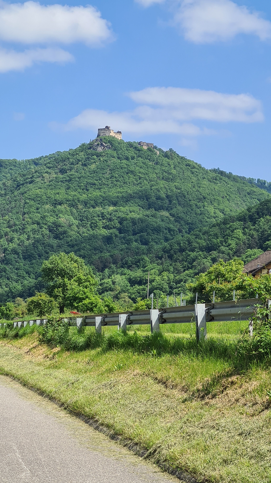 Bei Melk beginnt die Wachau – die Landschaft ist nun geprägt von Weinanbau und Marillenbäumen. Wir entscheiden kurzfristig, nicht wie geplant am linken Ufer weiterzufahren, sondern rechts zu bleiben.