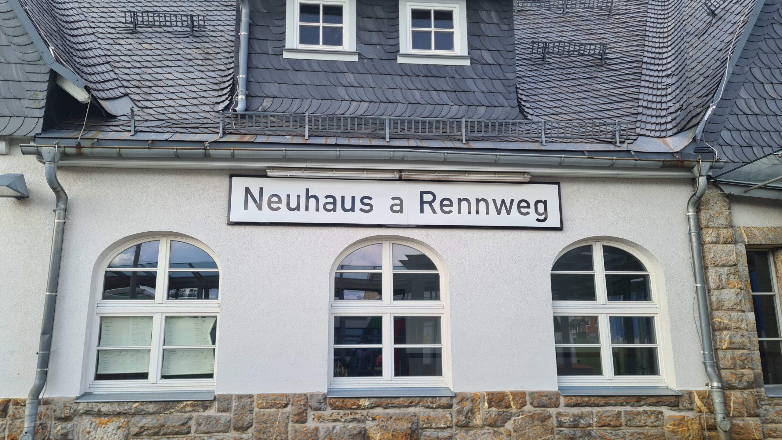 Mit dem ICE geht’s erstmal nach Eisenach, dann mit 40 Zwischenhalten (!) nach Neuhaus, Bummelbahn durch schöne hügelige Landschaft. Hier ist zunächst Sonnenschein!