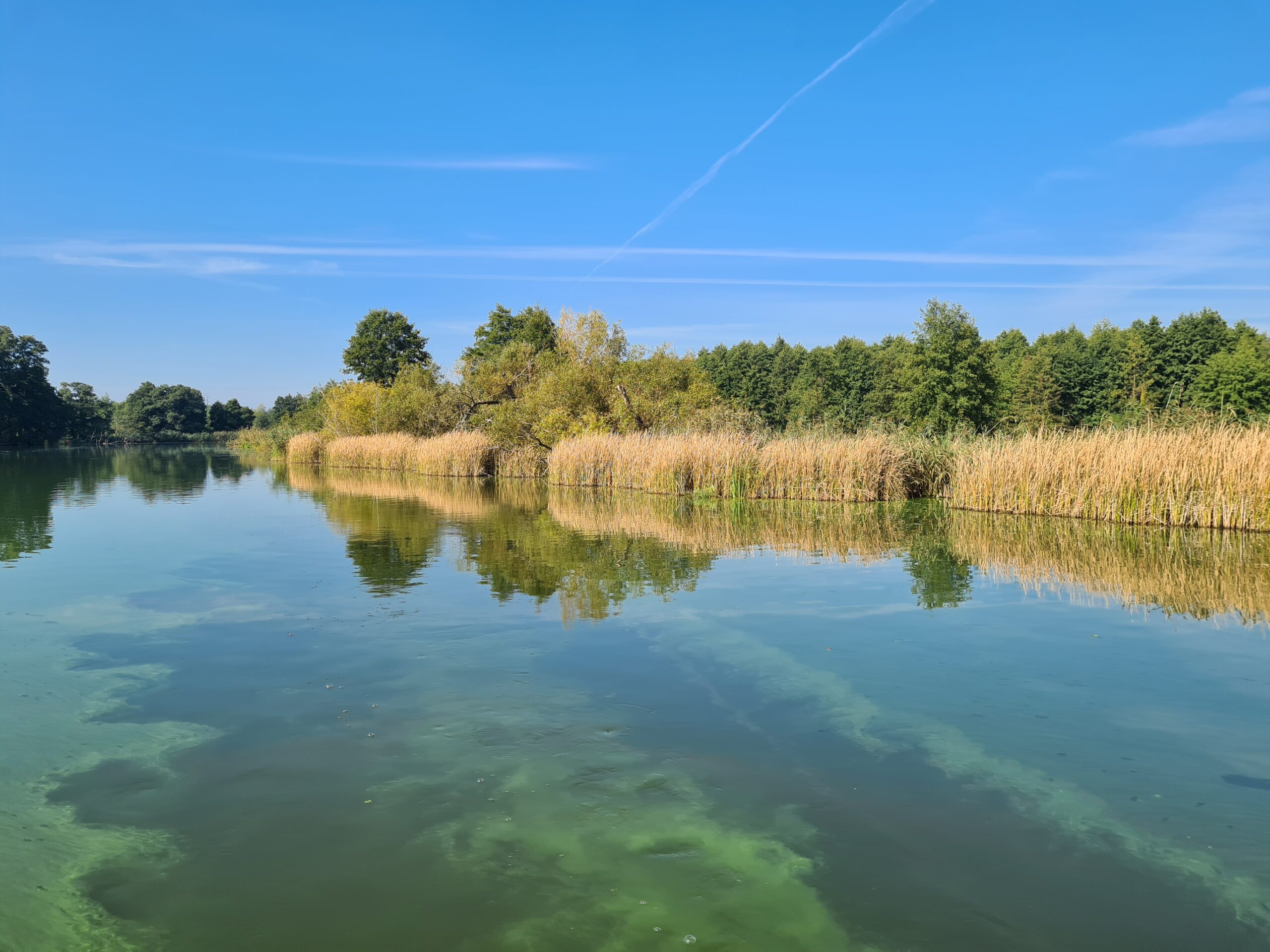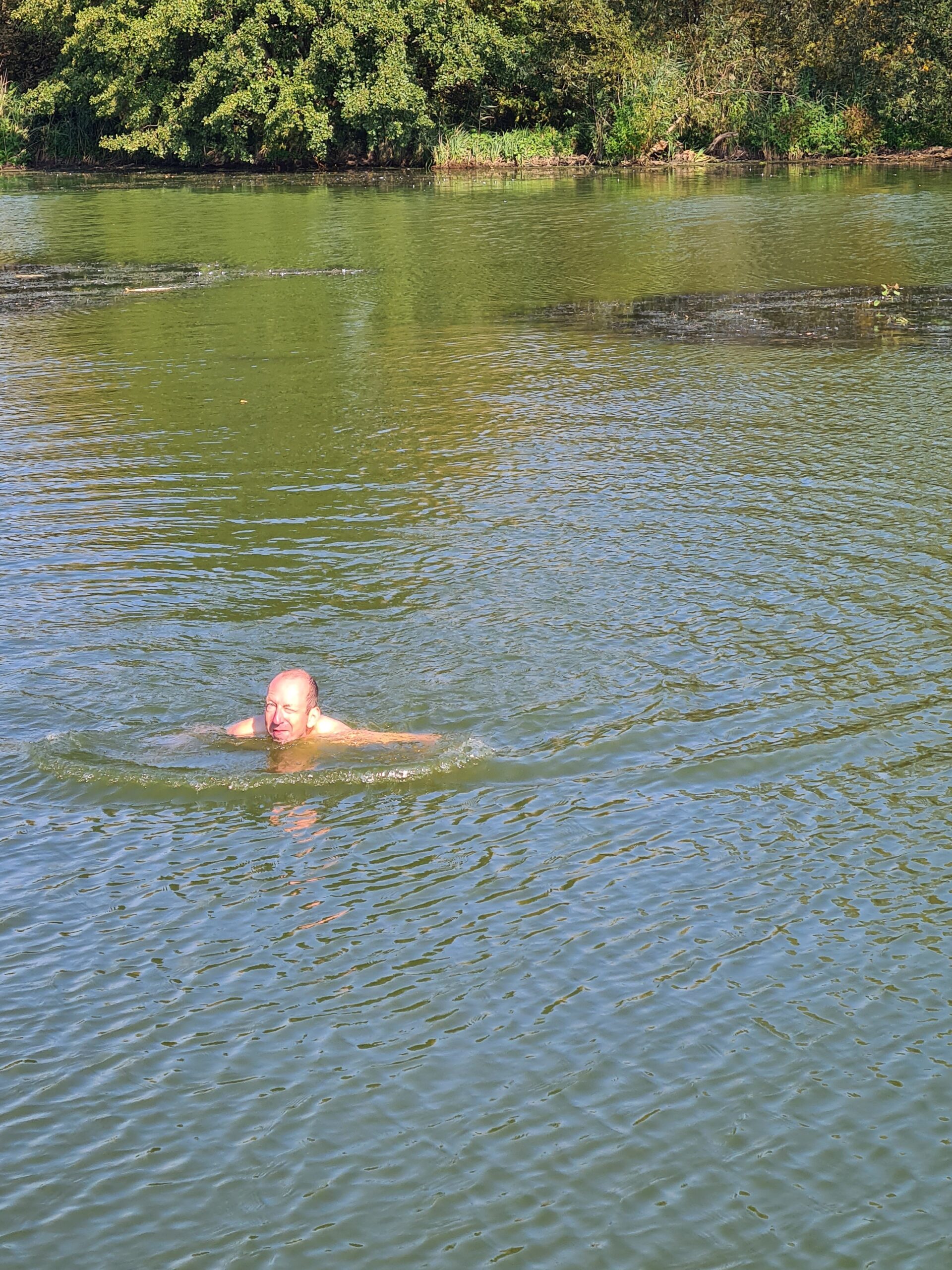 Das tolle Wetter nutzen wir für eine Badepause im Trebelsee kurz vor Ketzin. Das Wasser hat heute 19,2 Grad, aber irgendwie ist es ziemlich kalt am Anfang. Wir umrunden mehrfach unser Boot, Axel schwimmt drunter durch und schaut sich den Aufbau mal von unten an.