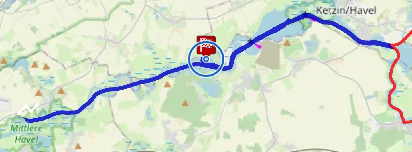 Nach der Wendung – an dieser Stelle waren wir bei der Hausboottour 2020 auch schon, wir verbinden also beide Strecken – fahren wir zurück bis Havelkilometer 43 und ankern dort so, daß wir den Sonnenuntergang anschauen können.