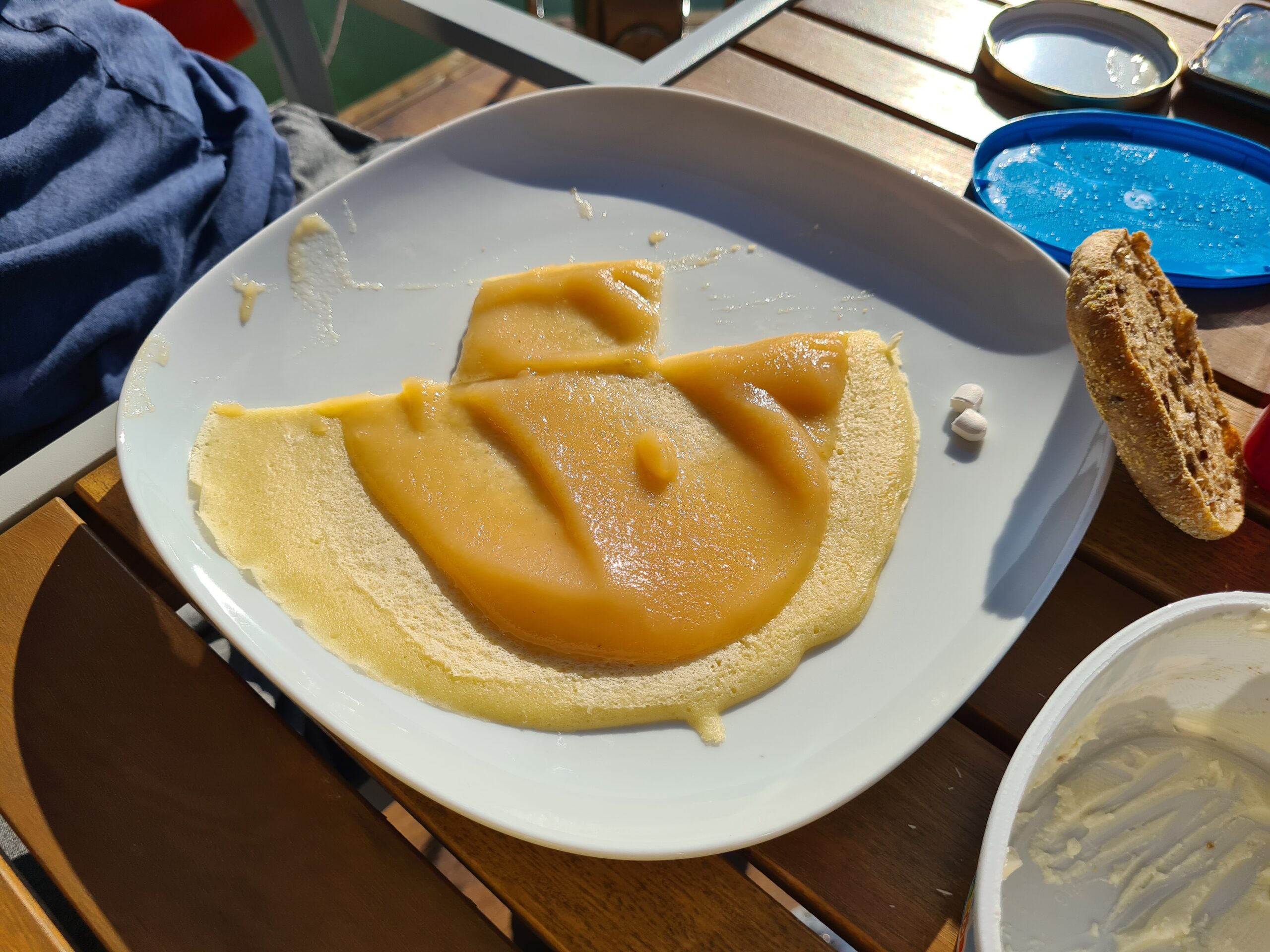 Wir frühstücken draußen, es gibt Pancakes – sehr lecker! Wahlweise mit Zucker, Nutella oder Apfelmus. Ein Teammitglied macht auf das Nutella noch Banane drauf….