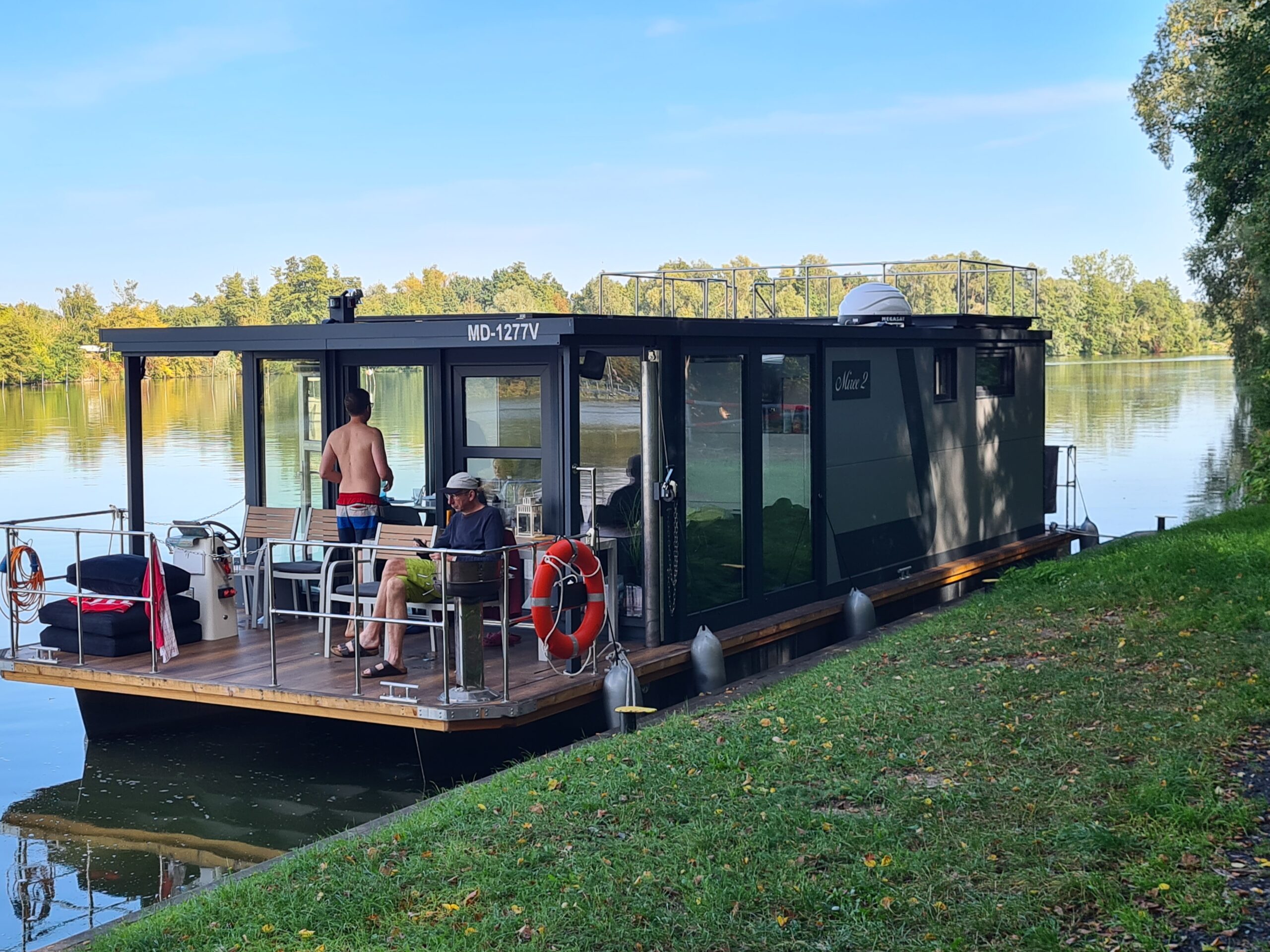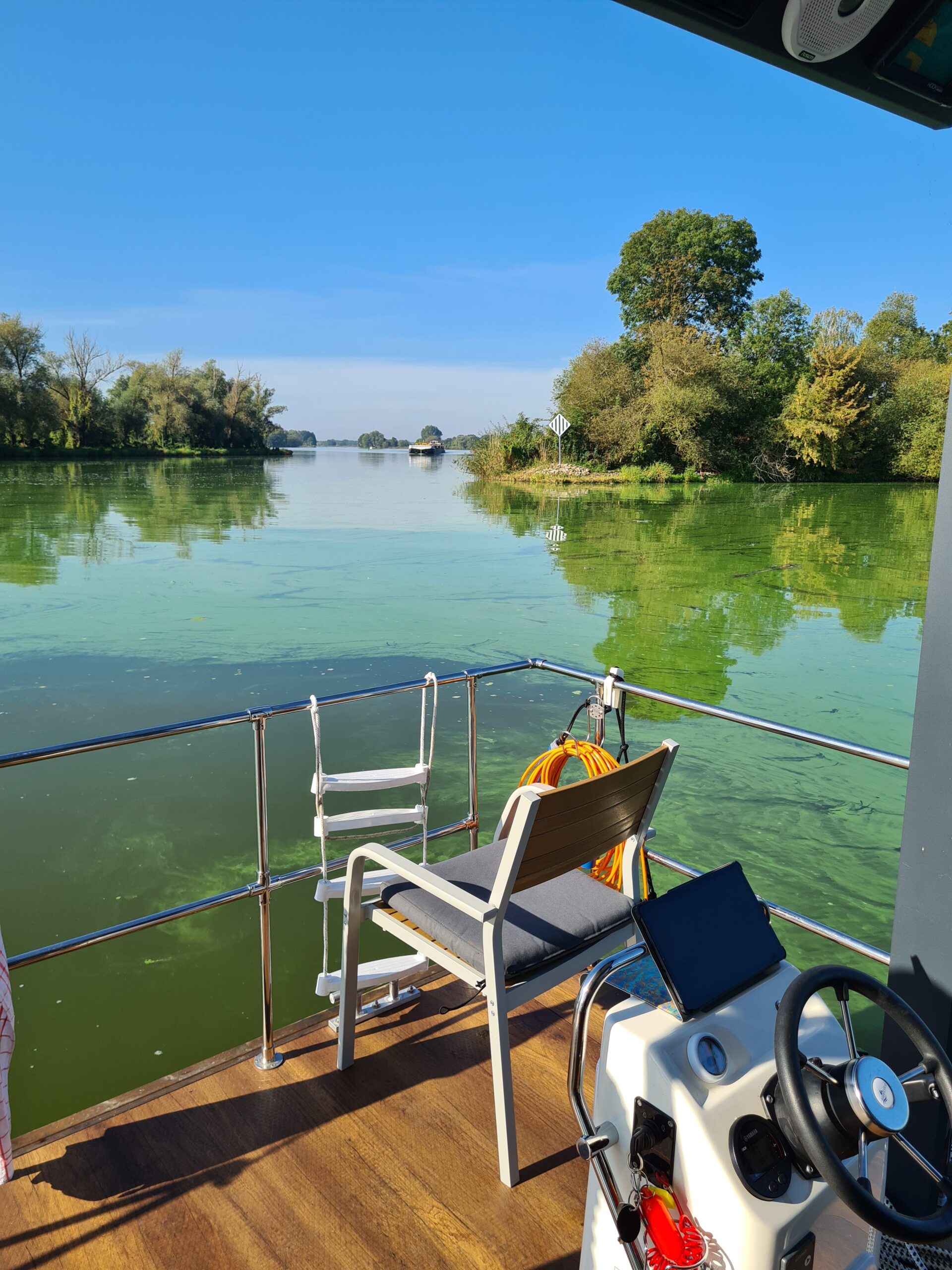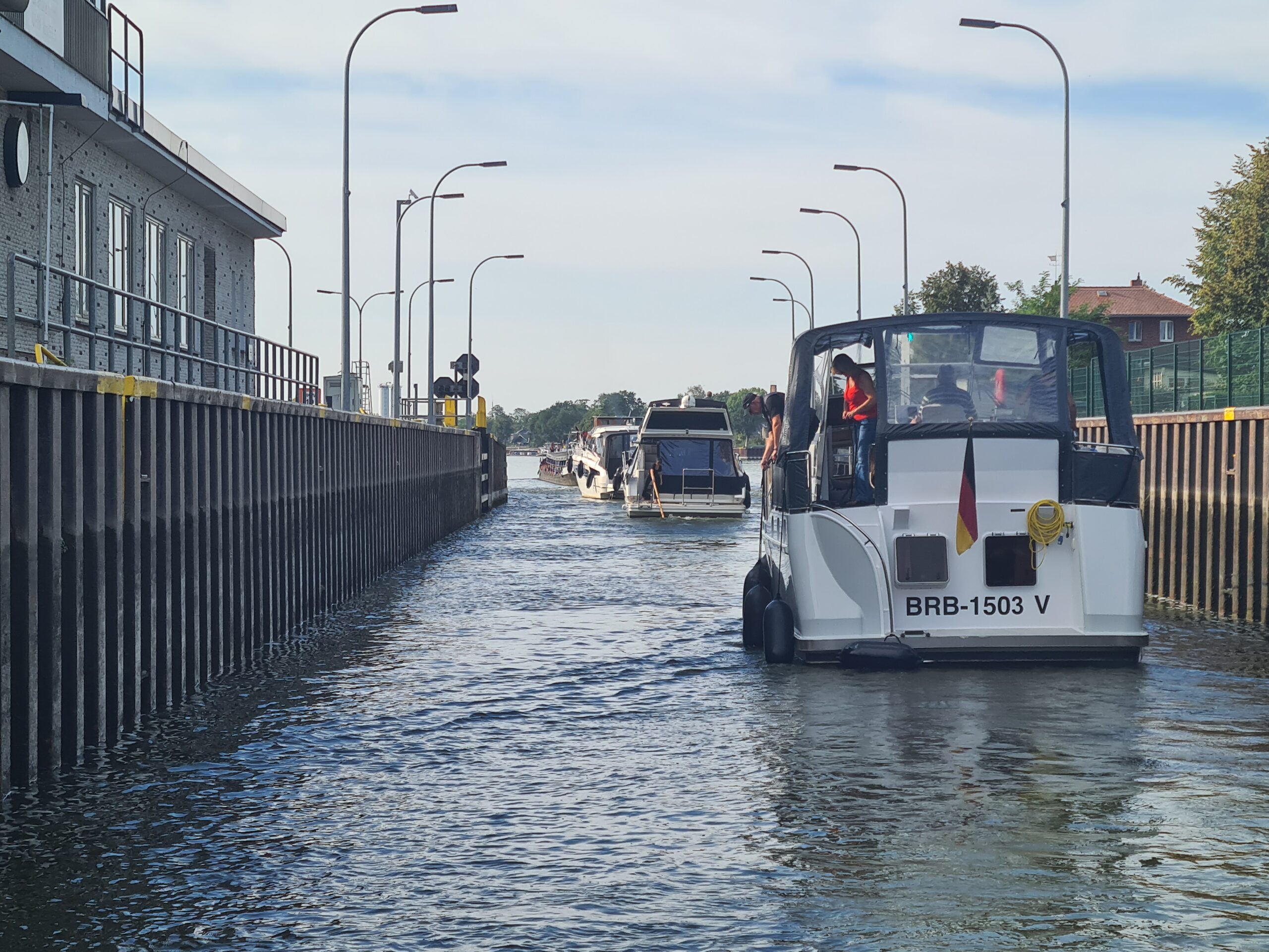 Diesmal sind wir nicht alleine in der Schleuse, sondern mit 2 Frachtern und 3 anderen Booten. Zum Glück sind wir inzwischen richtig fit im Umgang mit dem Hausboot.
