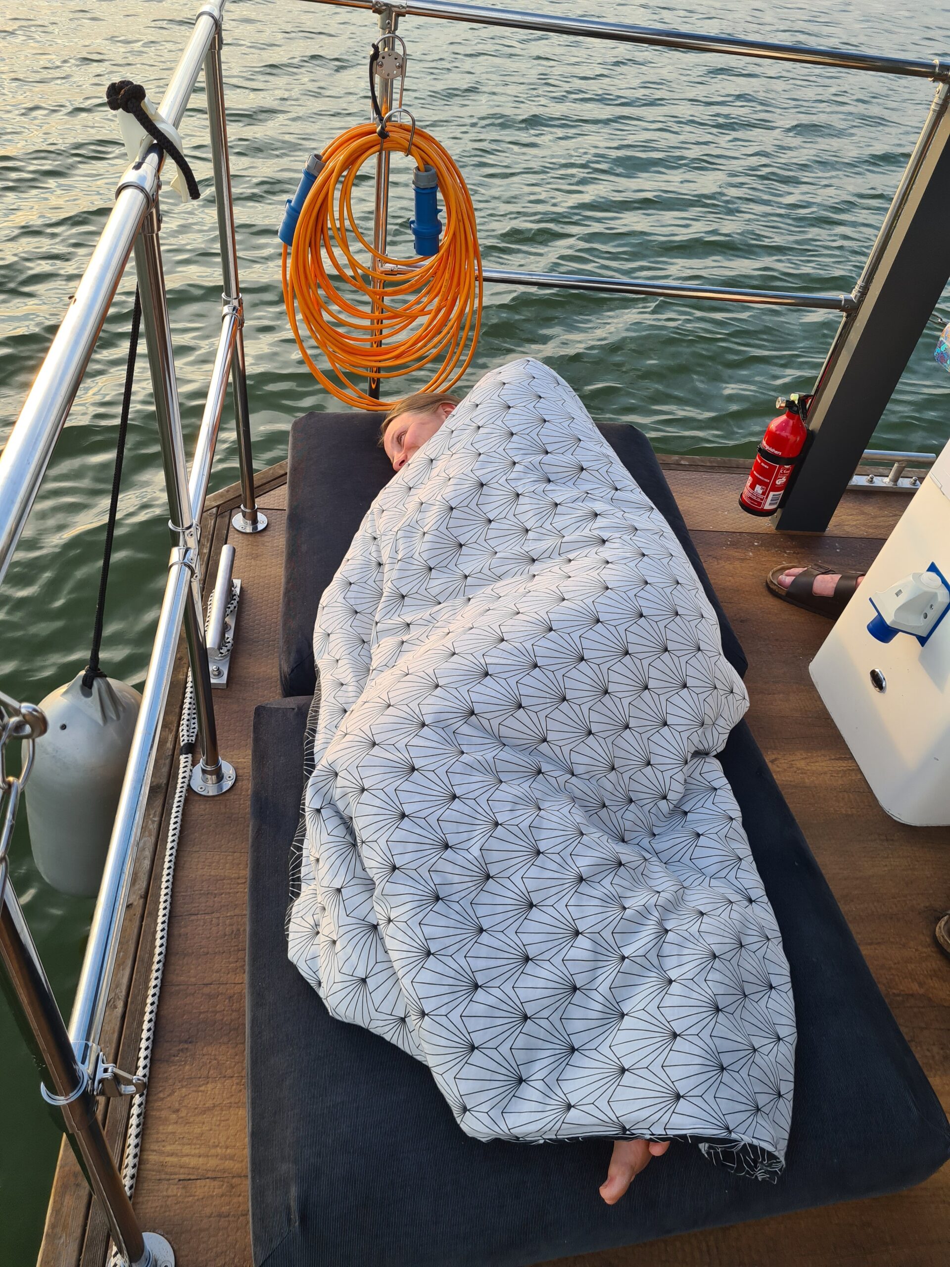 Bei diesem Boot gibt es leider keine richtig getrennten Schlafräume, alles ist nur durch Vorhänge getrennt – diese dämpfen aber die Schnarchgeräusche nicht so gut…