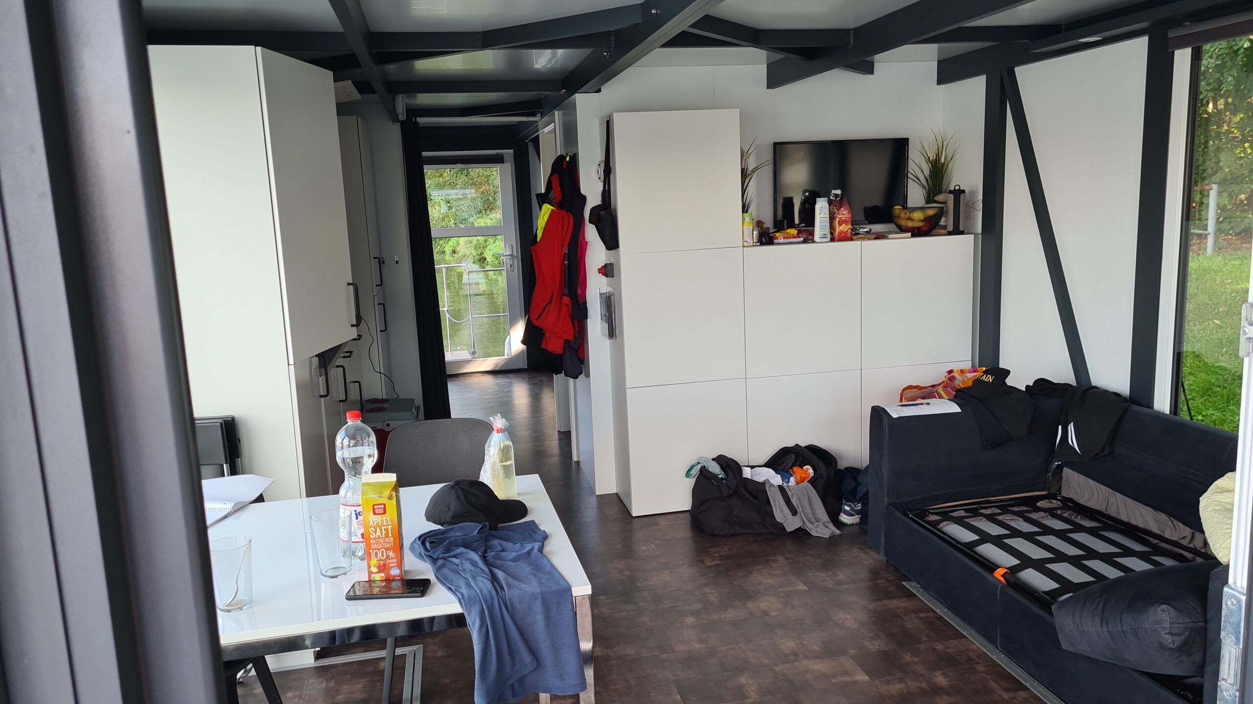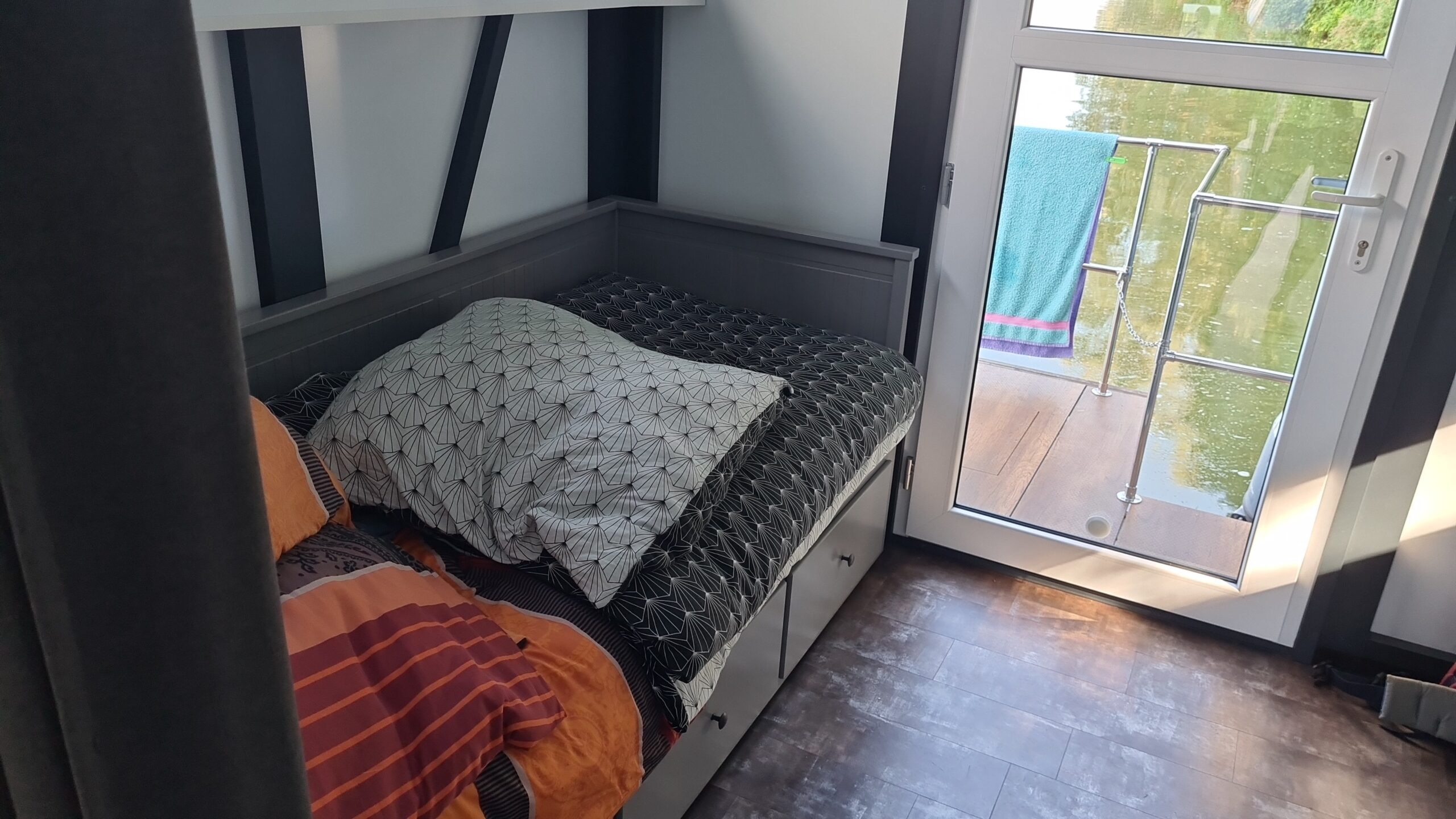 Unsere ÜbernachtungsbuchtEin Badestop, Wasser ist 0,5 Grad wärmer als gestern – also immernoch arg frisch!Hier sind wir wieder an der Schleuse, Zeit, euch unser Boot mal kurz von innen zu zeigen:Das Wohnzimmer, rechts schlafen Tobi und Gina , vorne links der Esstisch, dahinter der Küchenbereich. Hinter den Schränken rechts ist das Bad (mit einer sehr niedrigen Toilette…)Hier mein Bett, auf der rechten Seite ist Axels Bett, durch die Tür geht’s Richtung Heck