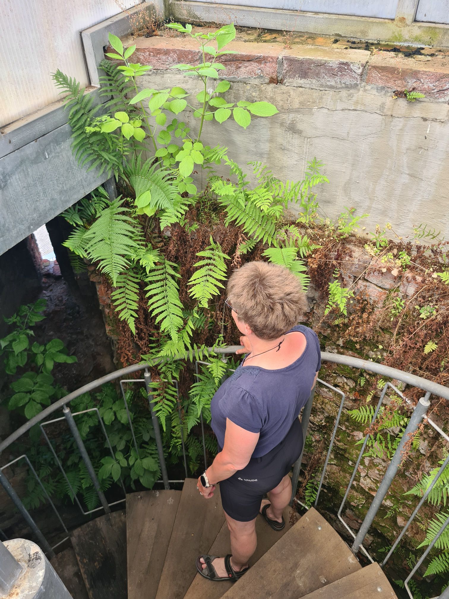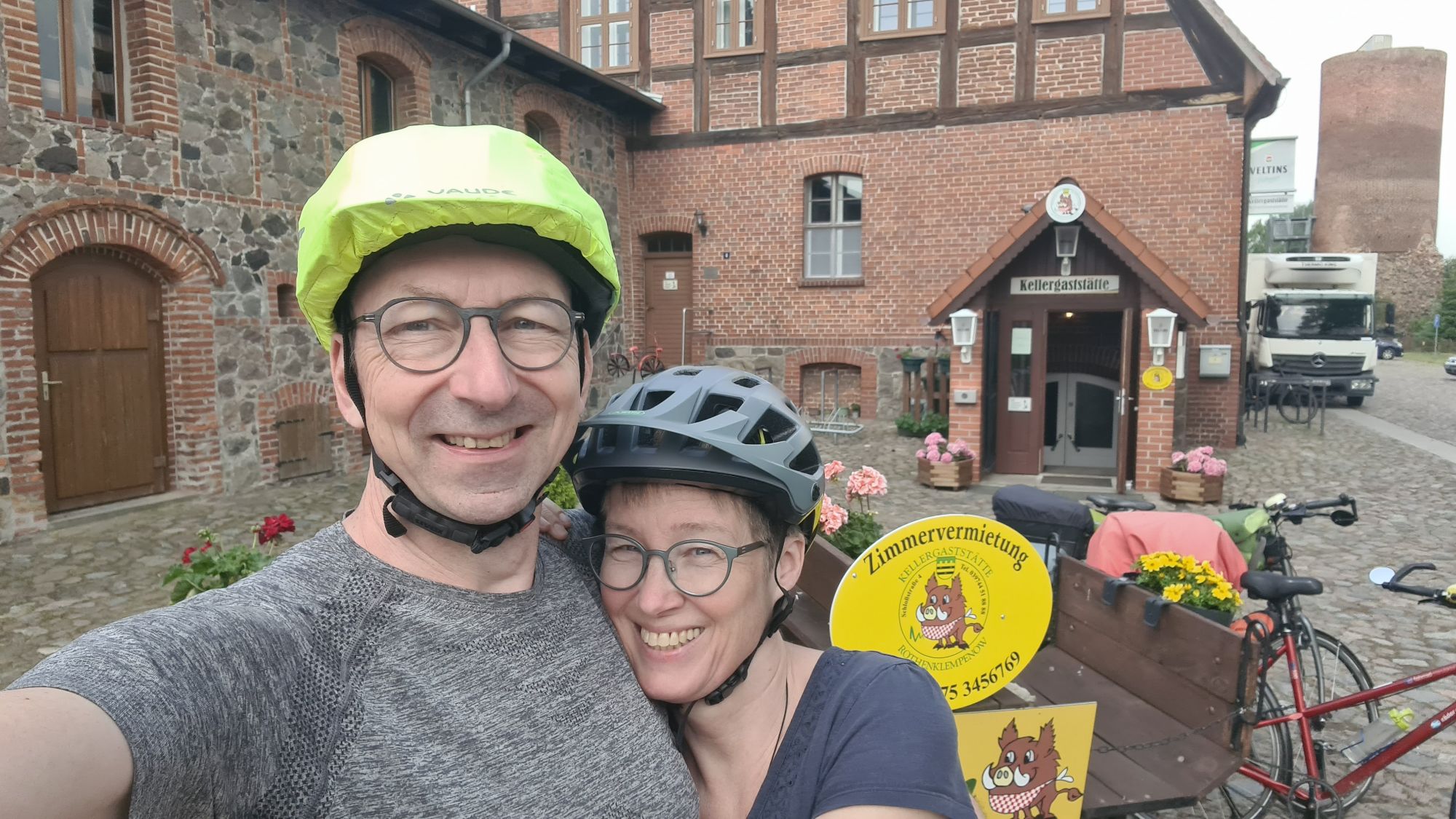 Frühstück im KellergewölbeSchloßgartenSehr empfehlenswerte Unterkunft!Juchuh, wir dürfen auf den Turm! Da hat man eine tolle Aussicht (wer mich kennt weiß um die leichte Ironie… – meine Höhenangst klettert mit!)Der Schlüssel zur unteren TurmtürMutig treppauf!Wirklich ein schöner Blick Da unten warten unsere Räder Im Turmbiotop