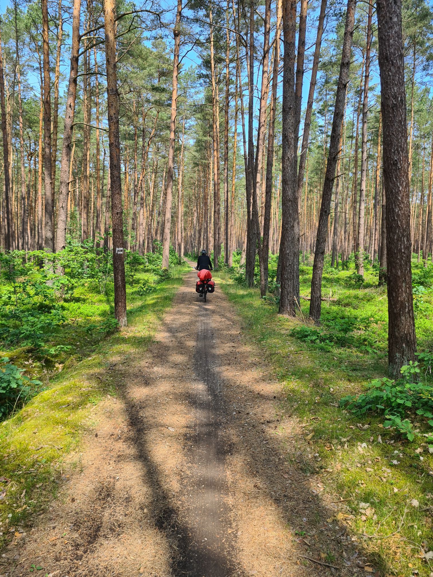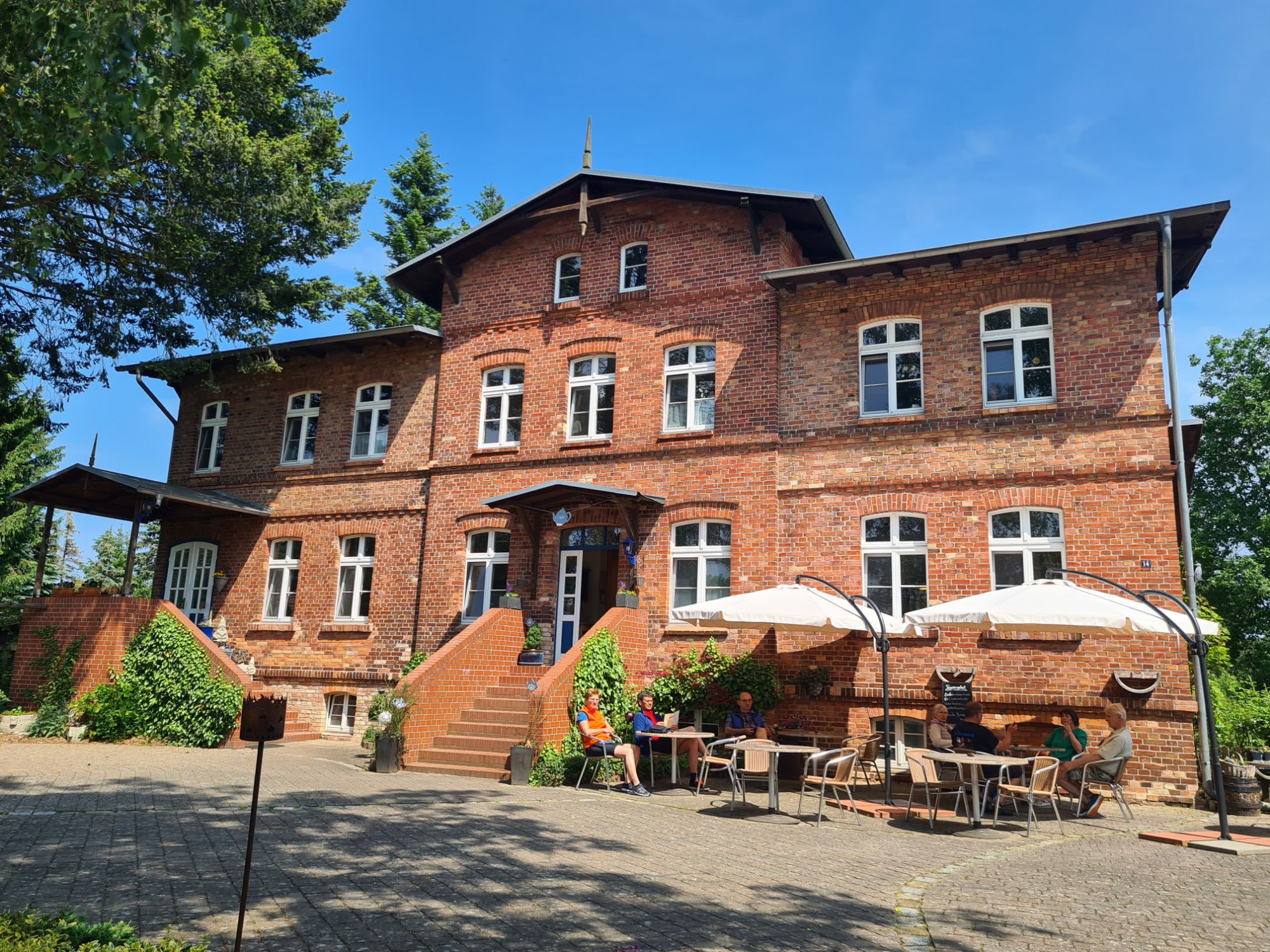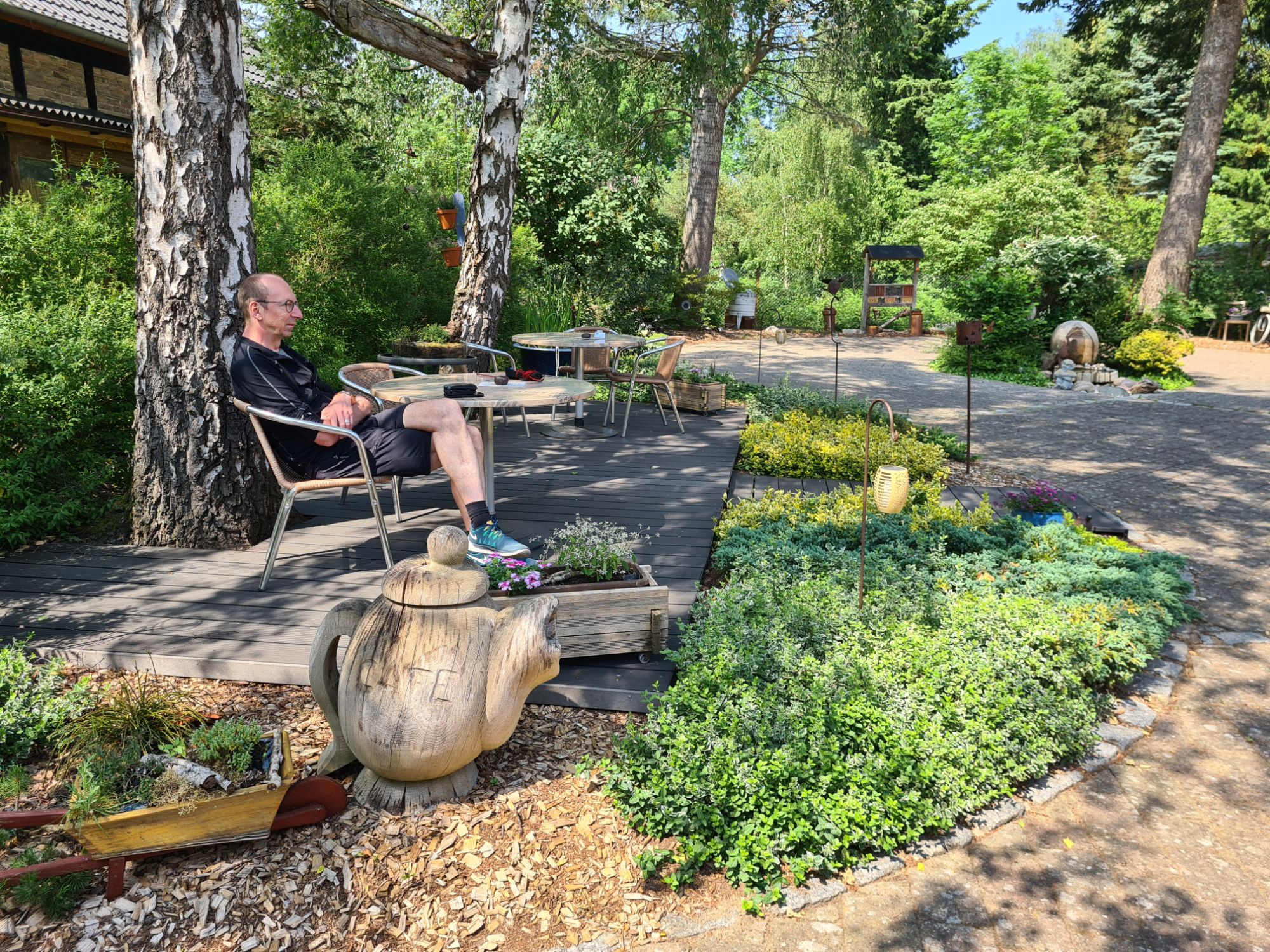 Axels Handy ist beschissen worden, der arme Vogel hat Durchfall! Also erstmal putzen…Schöner Weg auf der alten Bahntrasse der Randower Bahn, die schon seit 1945 nicht mehr befahren wirdHier wohnen 6 der 7 Zwerge – in LudwigshofHafen in RiethTolles kleines Café in Rieth, sogar mit Hafermilch, und köstlichem selbstgebackenem Kuchen2 Cappuccino, 2 Latte und 3 Stück Kuchen für 19,70 Euro, in einem idyllischen Garten