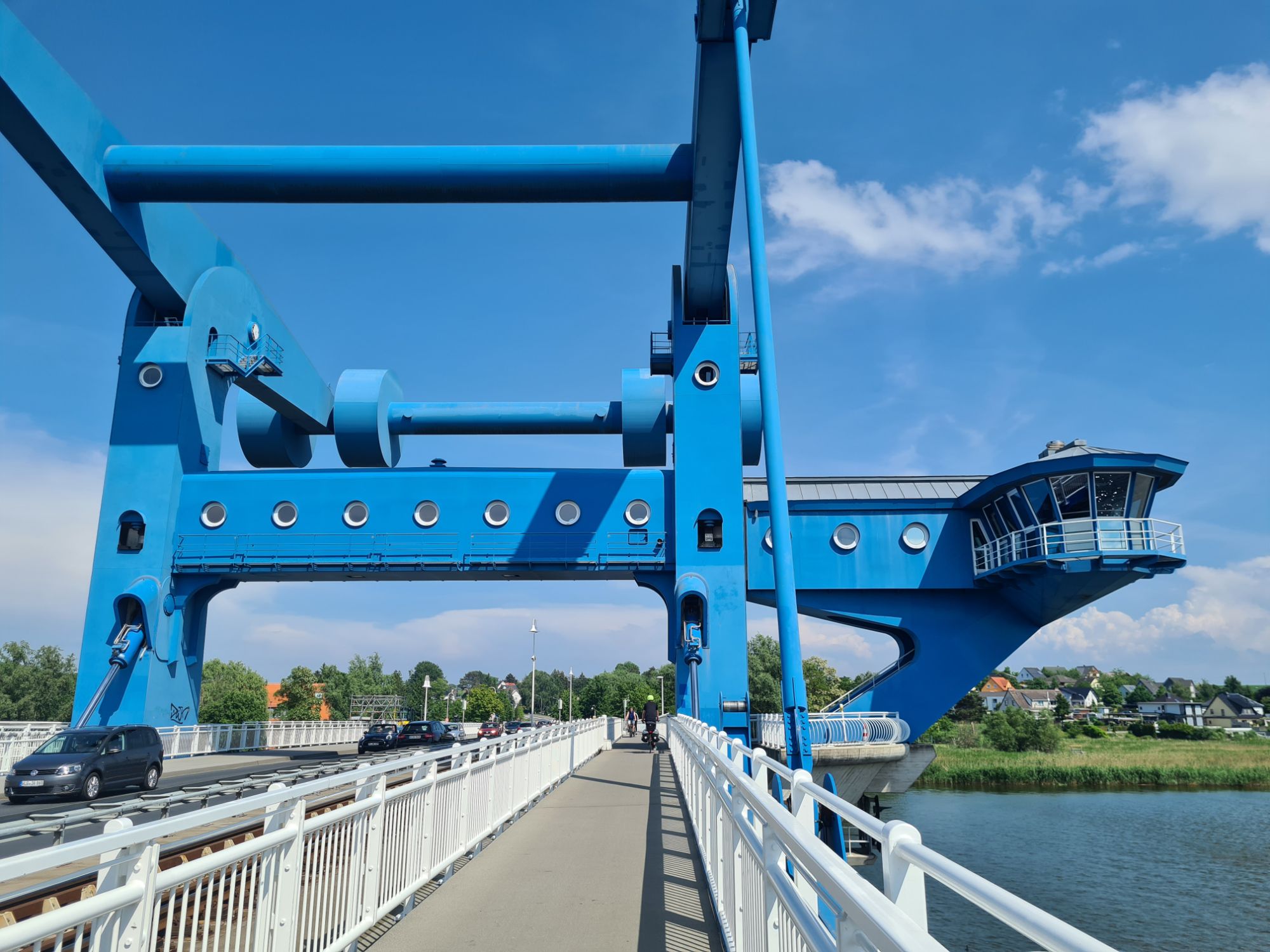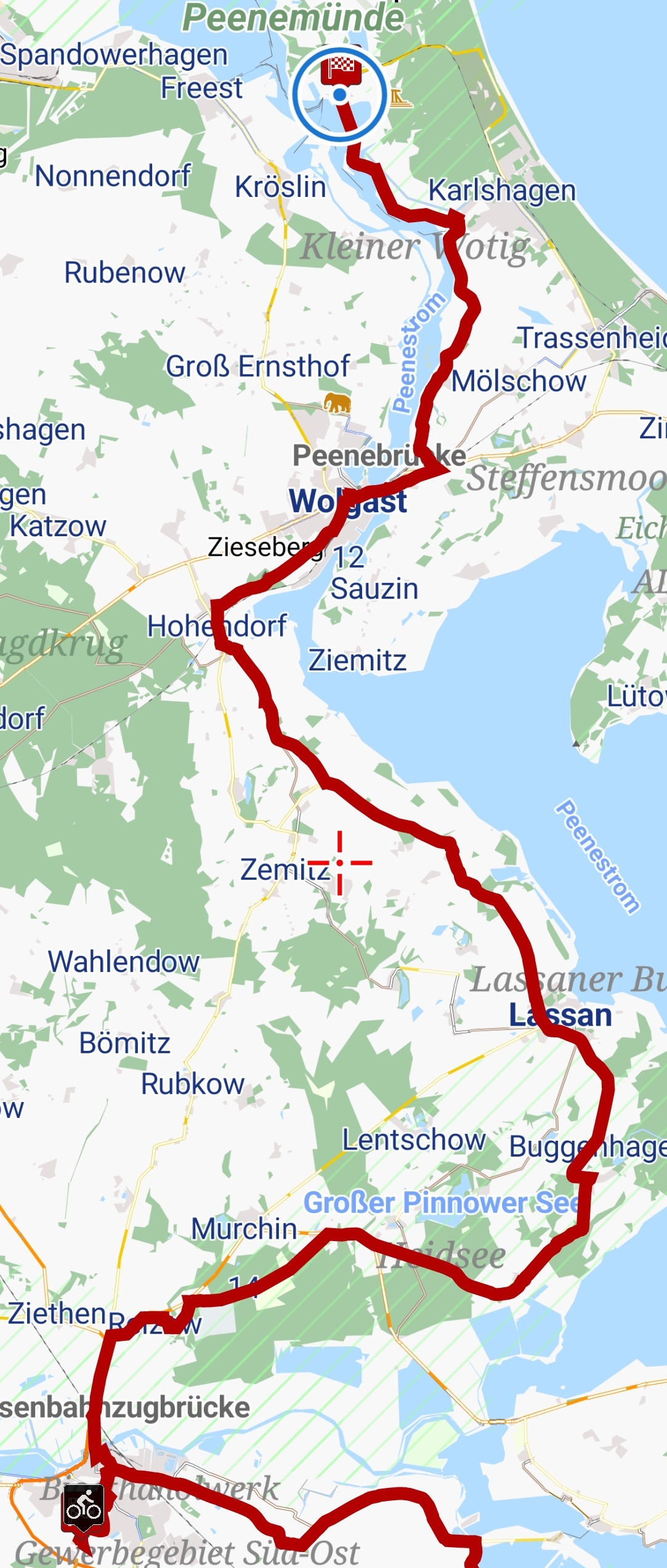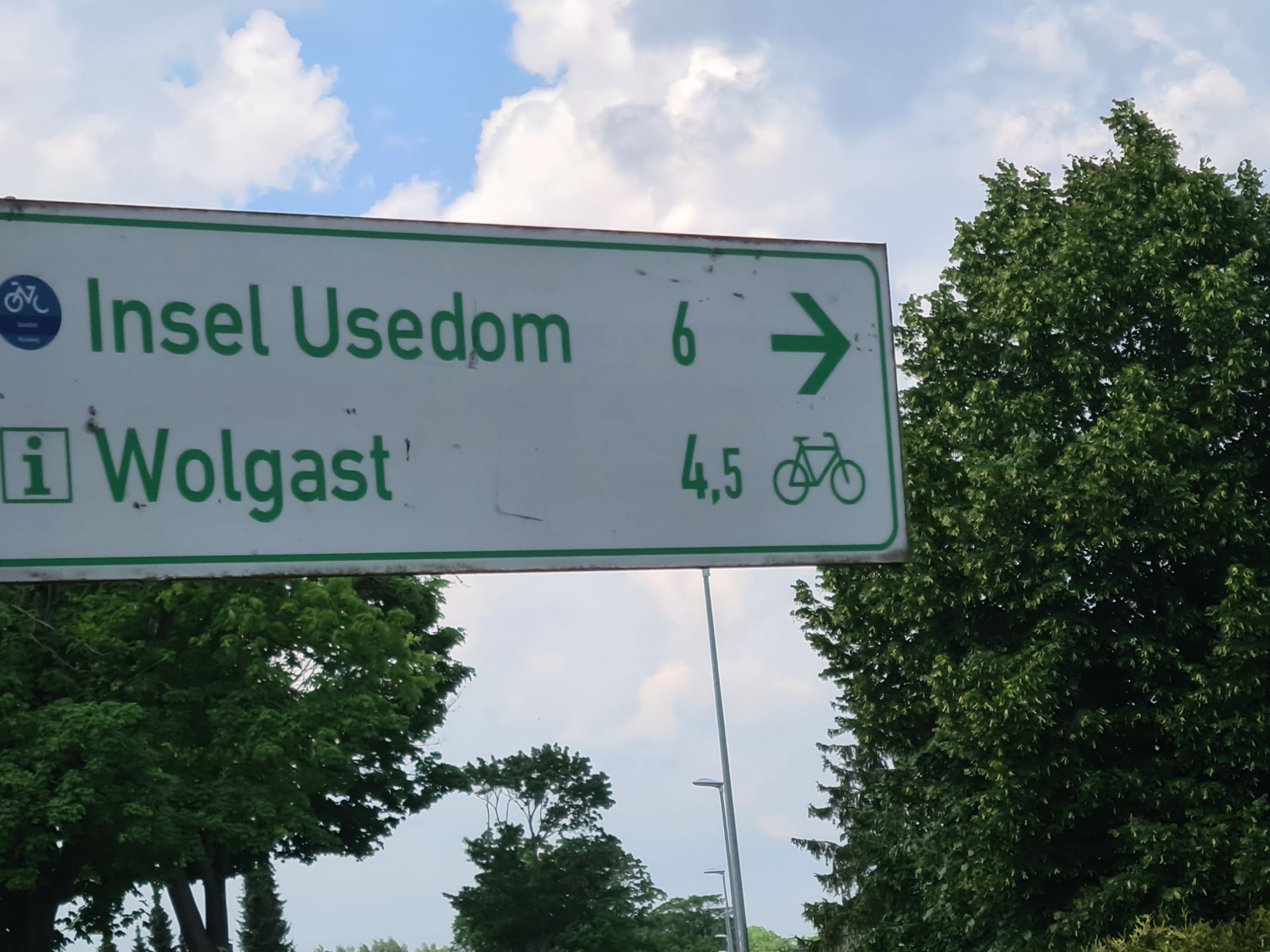timini fahren zu 3t weiter – gute Besserung, ax!Das Rad von ax in der BahnDie Peene in AnklamSchöne leicht hügelige Landschaft, hier mal guter Asphalt, sonst oft diese furchtbaren Platten mit den Haken drin, alle irgendwie unebenAchterwasser der PeeneErster Blick auf Wolgast, wo ax auf uns wartet, vorher machen wir noch eine kleine Pause mit Stracciatellakuchen, Brezeln und NüßchenIn Wolgast auf dem Marktplatz – beim Café Junge gibt es Hafermilch!Die Brücke nach Usedom Kurz vor Peenemünde – der Biber hat ganze Arbeit geleistet…… und zwar den ganzen Weg entlang!Das Museums – U-Boot, leider hat es schon geschlossen „Der rennende Elefant“„Der Zornige“Sonnenuntergang an Hafen von Peenemünde
