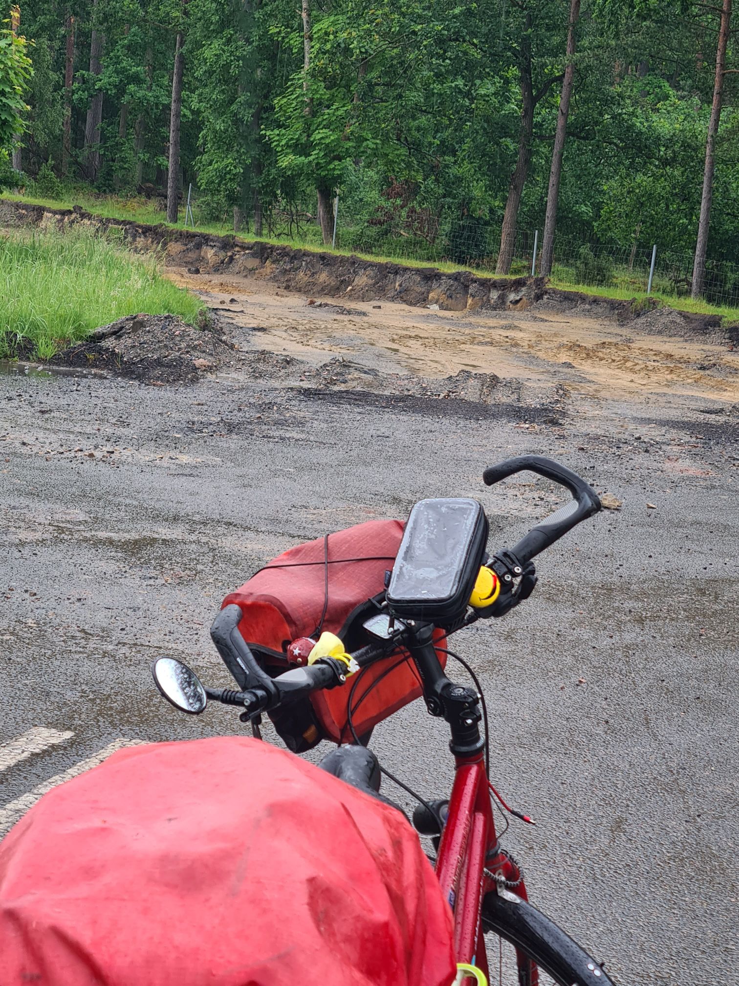 Autos dürfen nur 40 km/h fahren… das Team bespricht sich ausführlich. Entweder kurz in den Verkehr wagen oder zurückradeln, wobei wir den Weg durch den Beginn der Baustelle nicht zurück können, weil wir da einen steilen matschigen Abhang runtergeschoben haben, den wir sicher mit den Rädern nicht wieder hoch kommen.