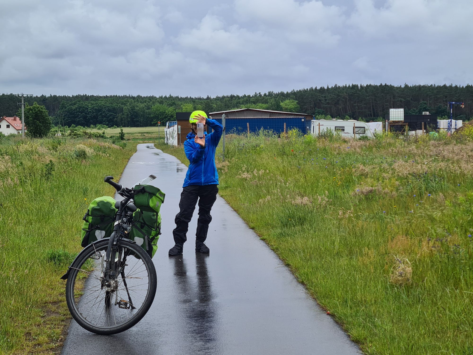 Nach 4 Kilometern beginnt der angesagte Regen, also erstmal Regenklamotten anziehen, dann feucht weiter.