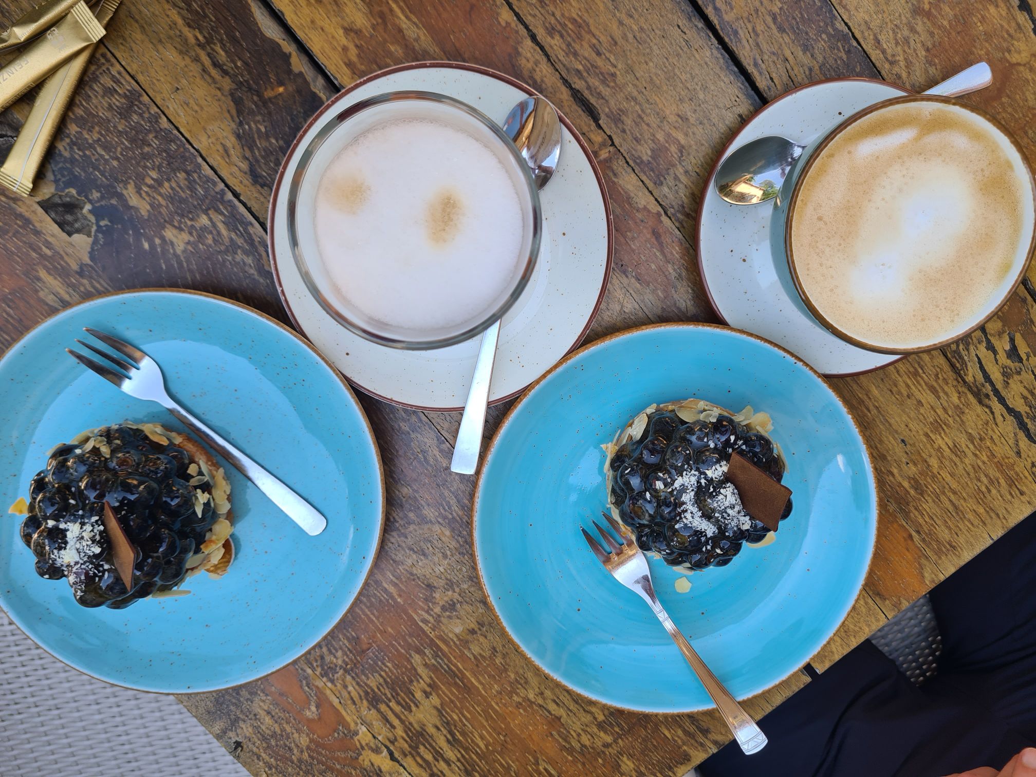 ….schweineteure köstliche Blaubeertörtchen, dazu Latte und Cappuccino
