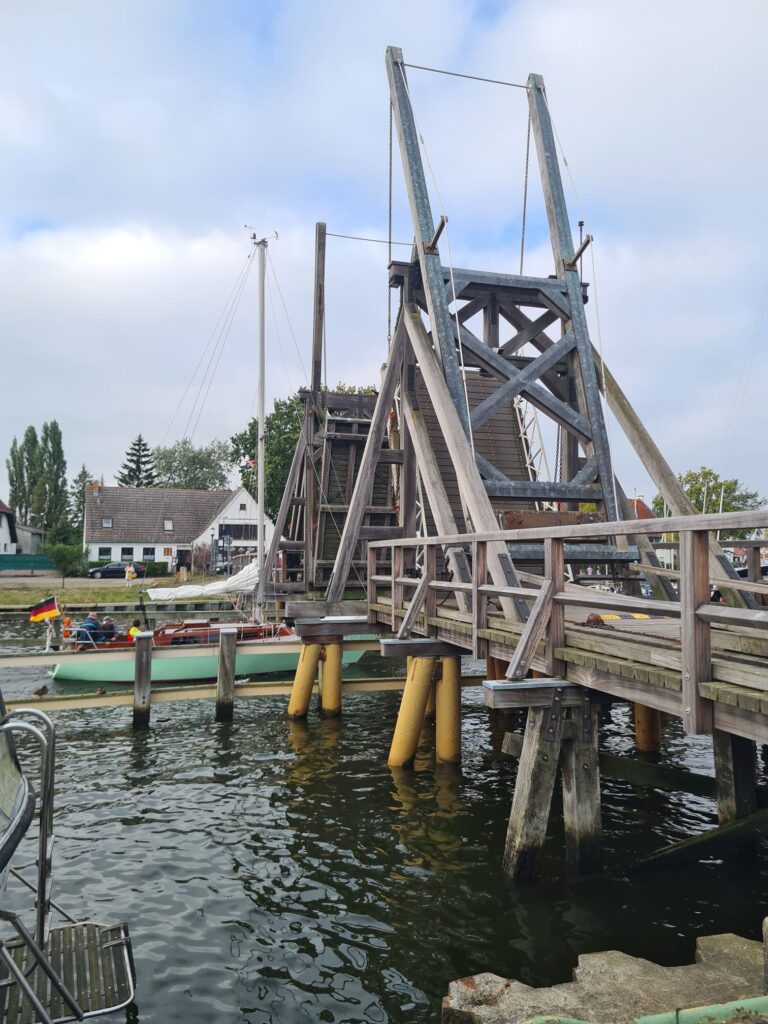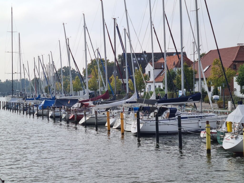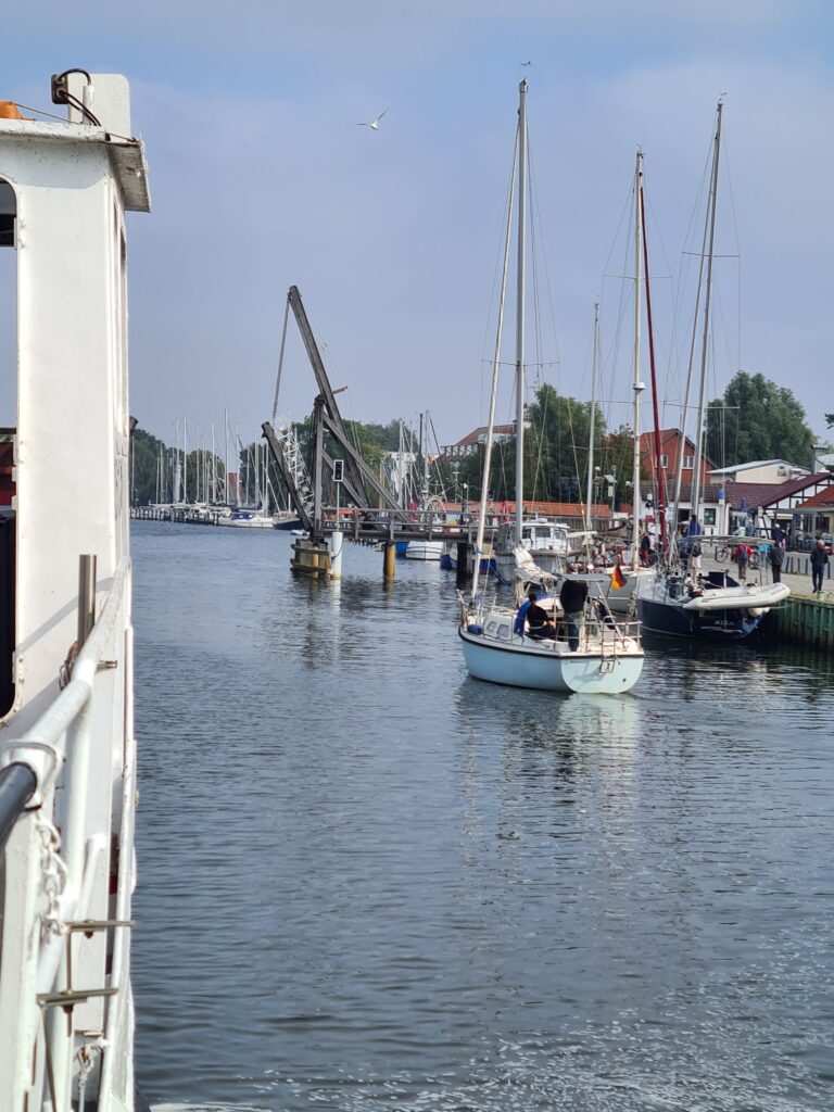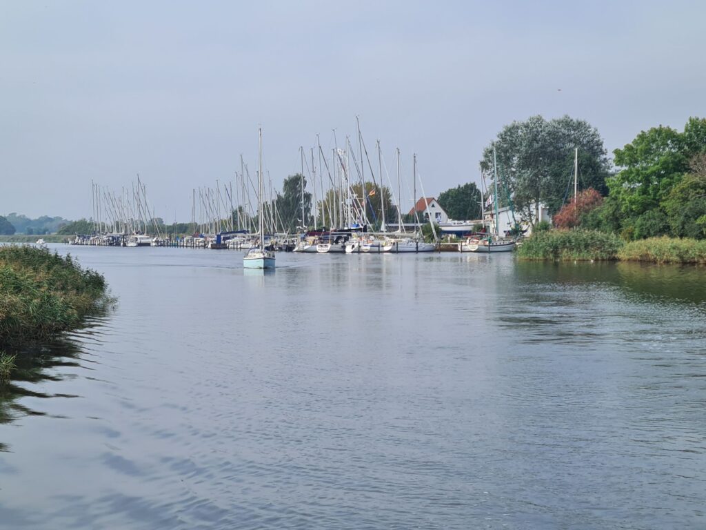 Auch heute war die Vorhersage wieder falsch, genau wie gestern fast den ganzen Tag bewölkt statt sonnig. Alle warmen Anziehsachen mitgenommen, weil wir Boot fahren wollen auf dem Greifswalder Bodden – da isses windig!