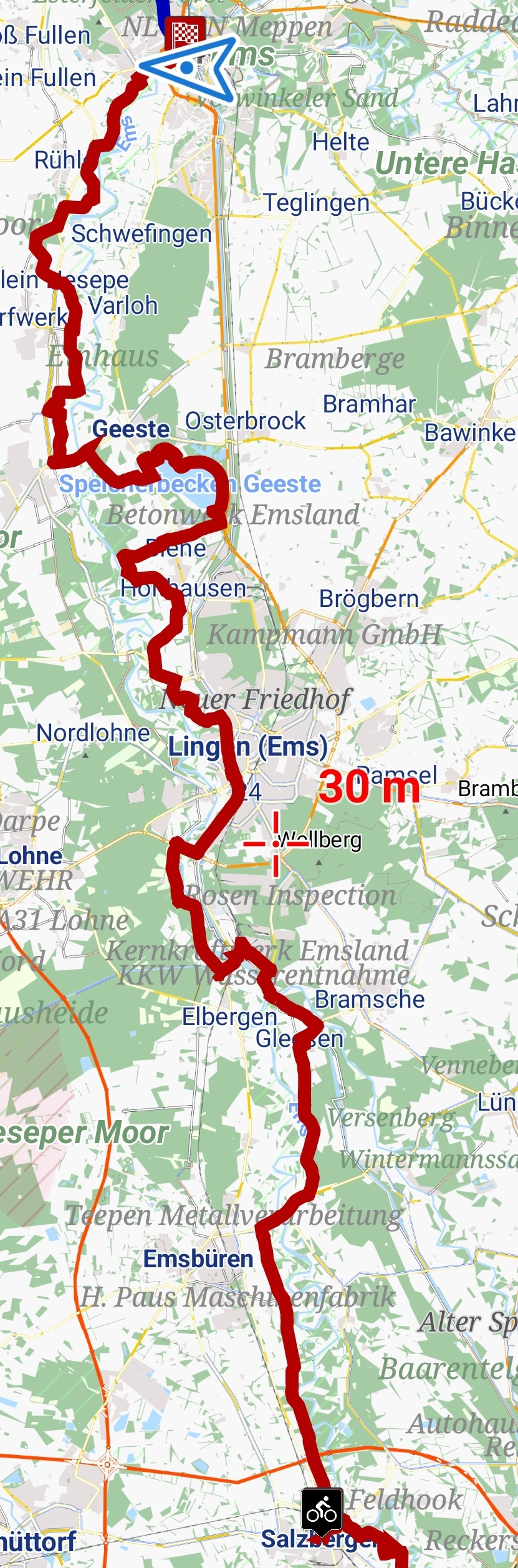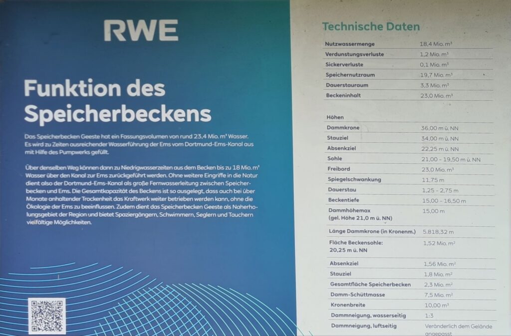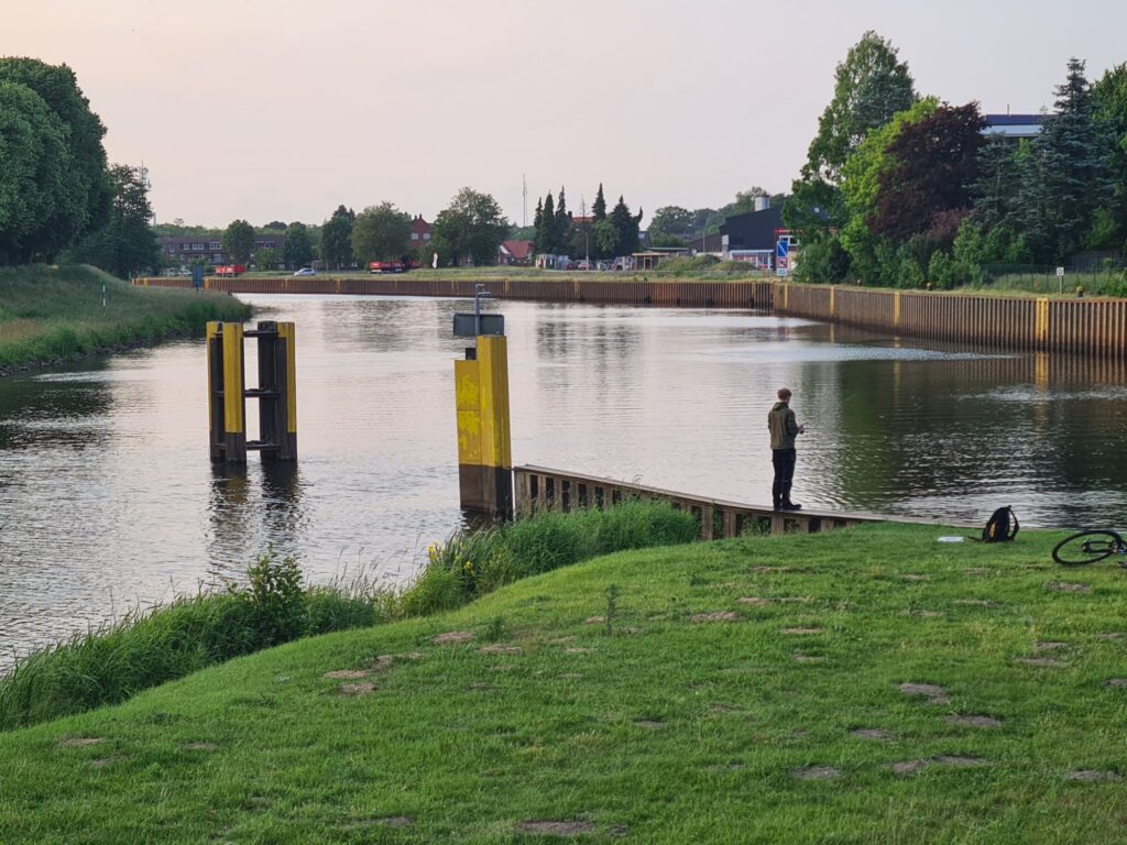 Hier fließt die Ems in den Dortmund-Ems-Kanal, die sich dann allerdings später wieder trennen.Zur Übersicht: Links die EmsLinks Große Aa, rechts Dortmund-Ems-Kanal + EmsDas zum Glück stillgelegte Kernkraftwerk EmslandKurz danach eine kleine Steigung, auch E-Bikes werden hier geschoben (Ausrede war Schaltfehler)… Wir kamen von unten.Weil wir an der Ems fahren, gibt es immer wieder Em und Ems!Ems-Vechta-KanalUnterwegs am KanalVerdiente Pause mit Feldblick nach gut 20 kmSpeicherbecken GeesteKuchenessziel am SpeicherbeckenAbendspaziergang: hier fließt die Hase (links) in den Dortmund-Ems-Kanal…… und hier vereinigen sich Ems und Dortmund-Ems-Kanal mal wieder.