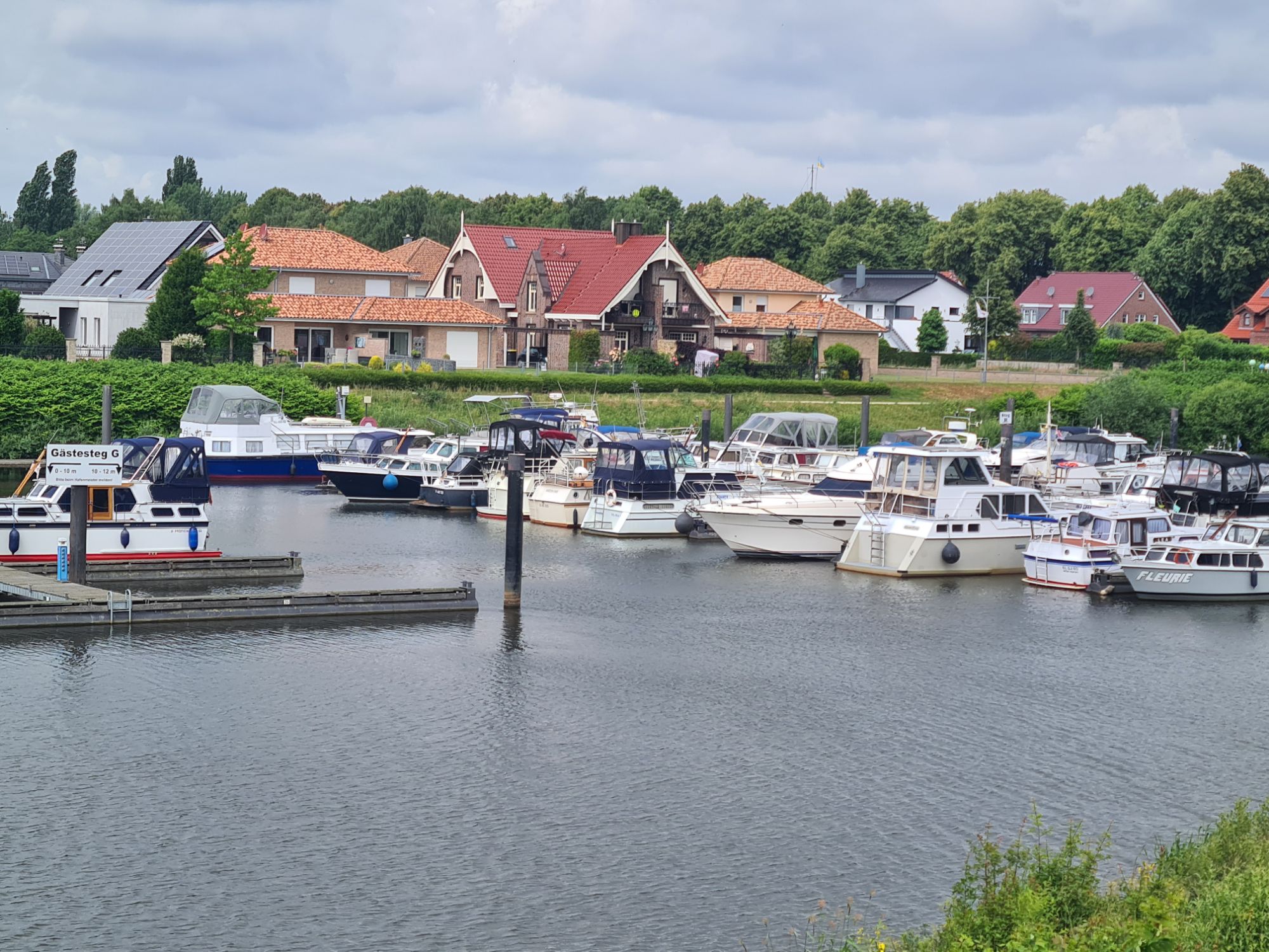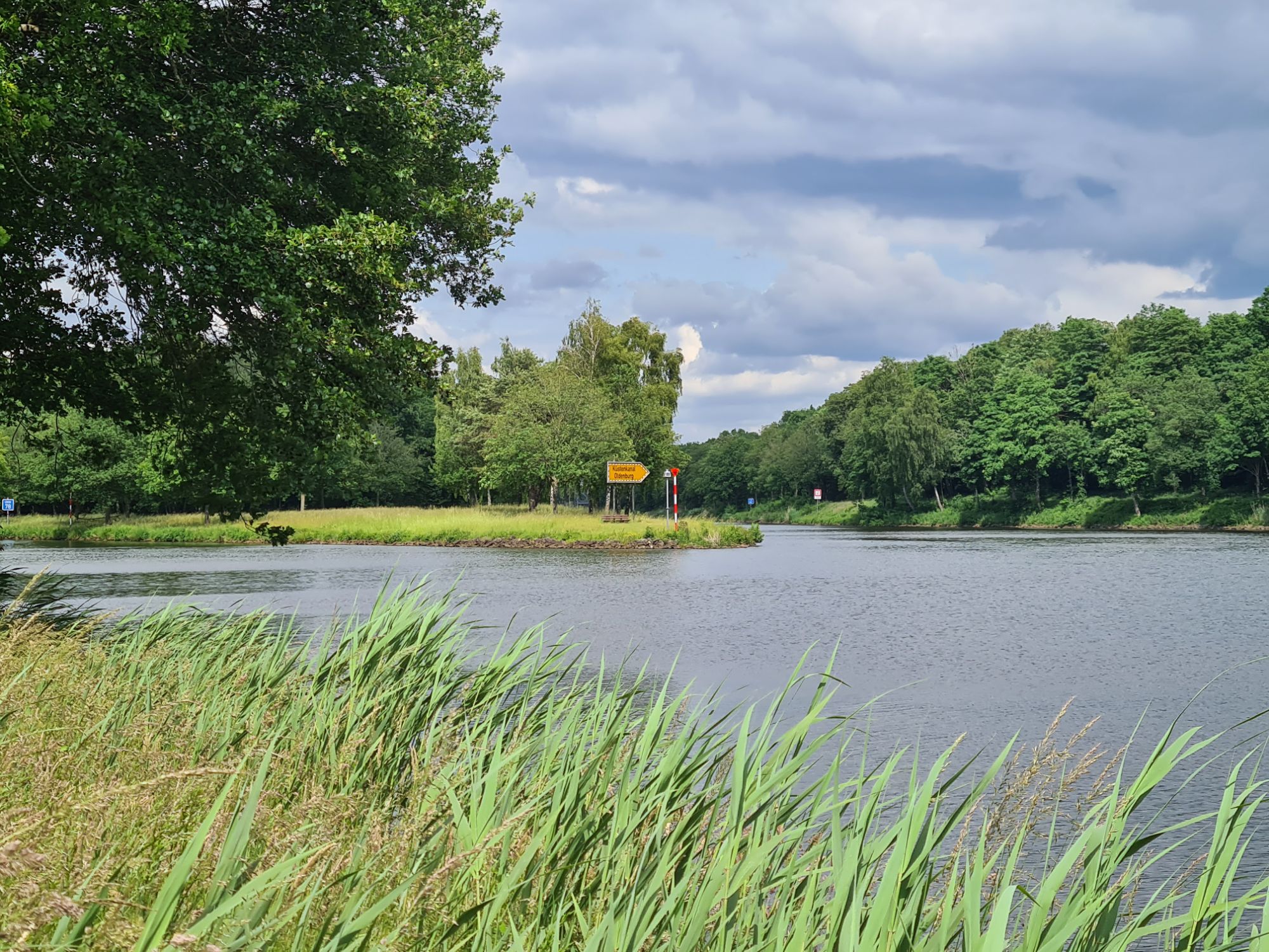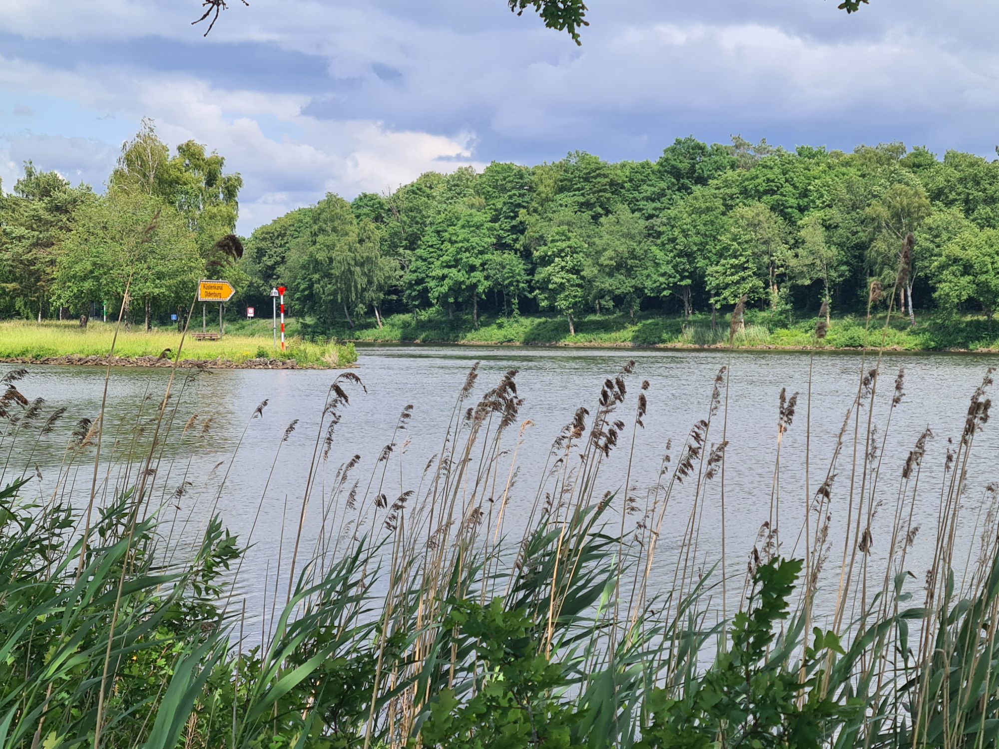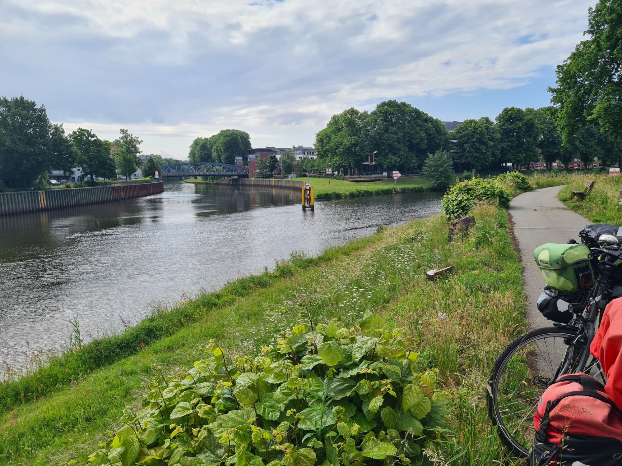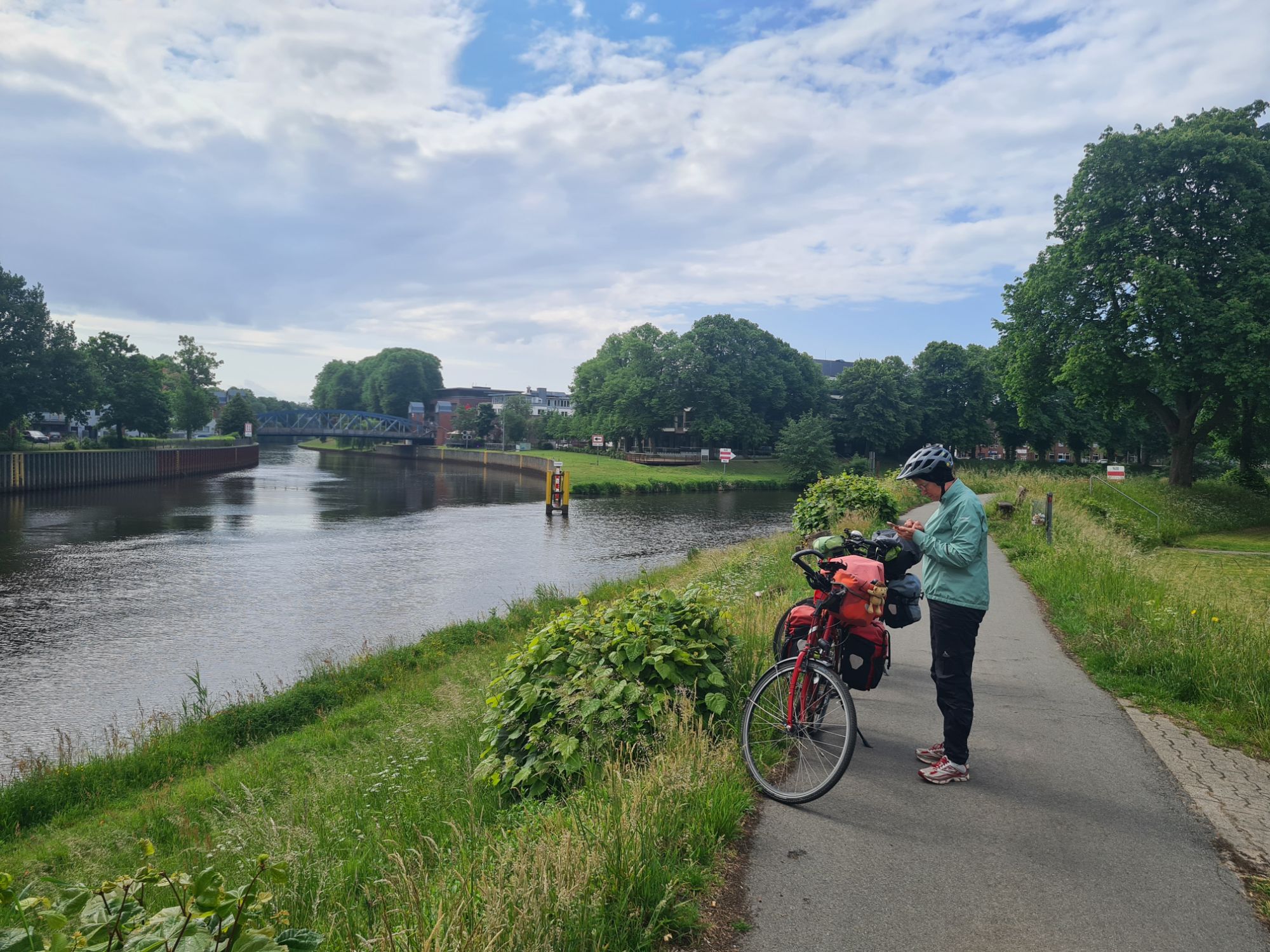 Los durch ein nettes WäldchenRechts die Ems, links der Dortmund-Ems-Kanal Ems, alte Ems und Kanal und wir mittendrinEiner der vielen Ems-AltarmeEms und Kanal, immer Mal weiter vereinigtAm KanalNina überm WehrKühe warten auf die Kuhfähre an der Spitze zwischen Ems und AltarmSchleuse Hüntel – wir haben heute mehrere passiert Yachthafen Emspark – sehr hübsch Was Photoshop alles kann, gleiches Bild ohne das Team.Die Ems bei Steinbild (das ist ein Ort!)Da kommen wir her – da geht’s hinAbzweig des Küstenkanals nach Oldenburg Angekommen!