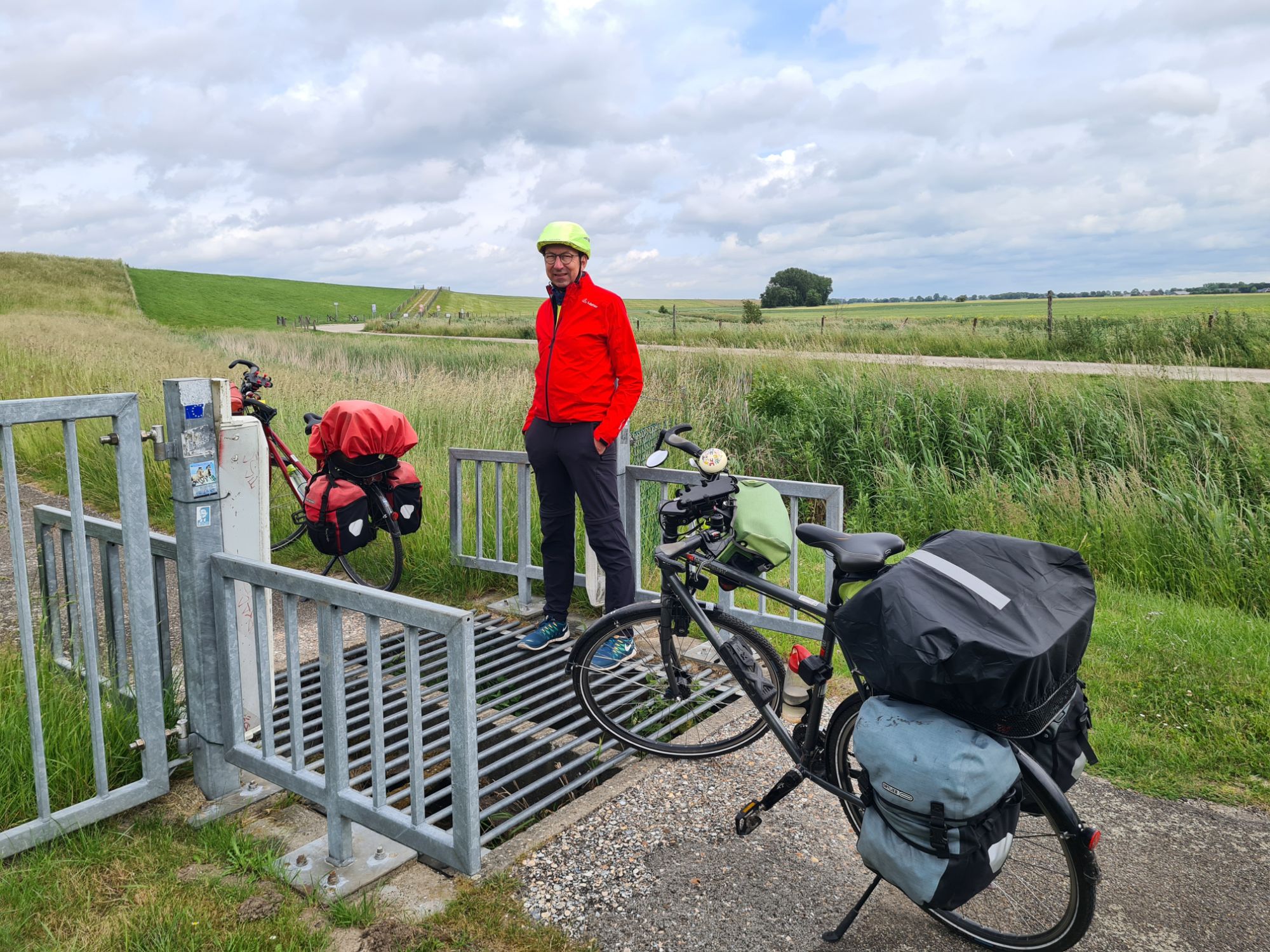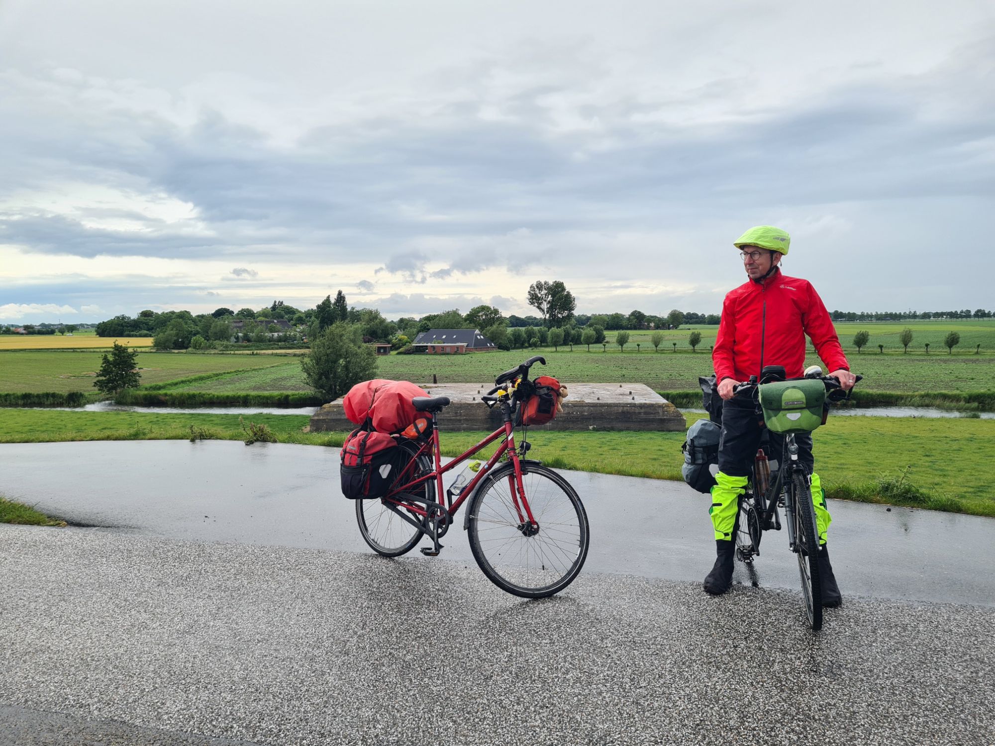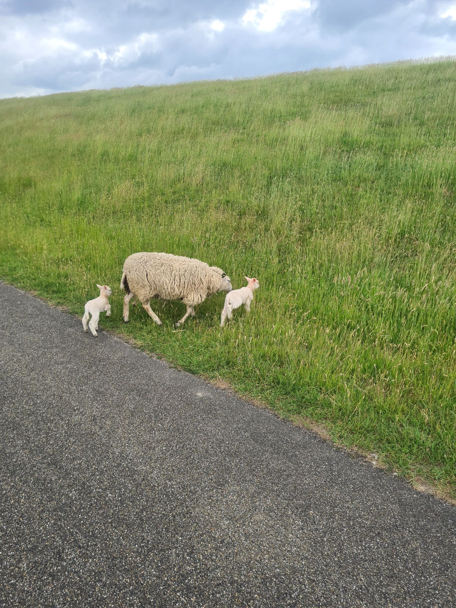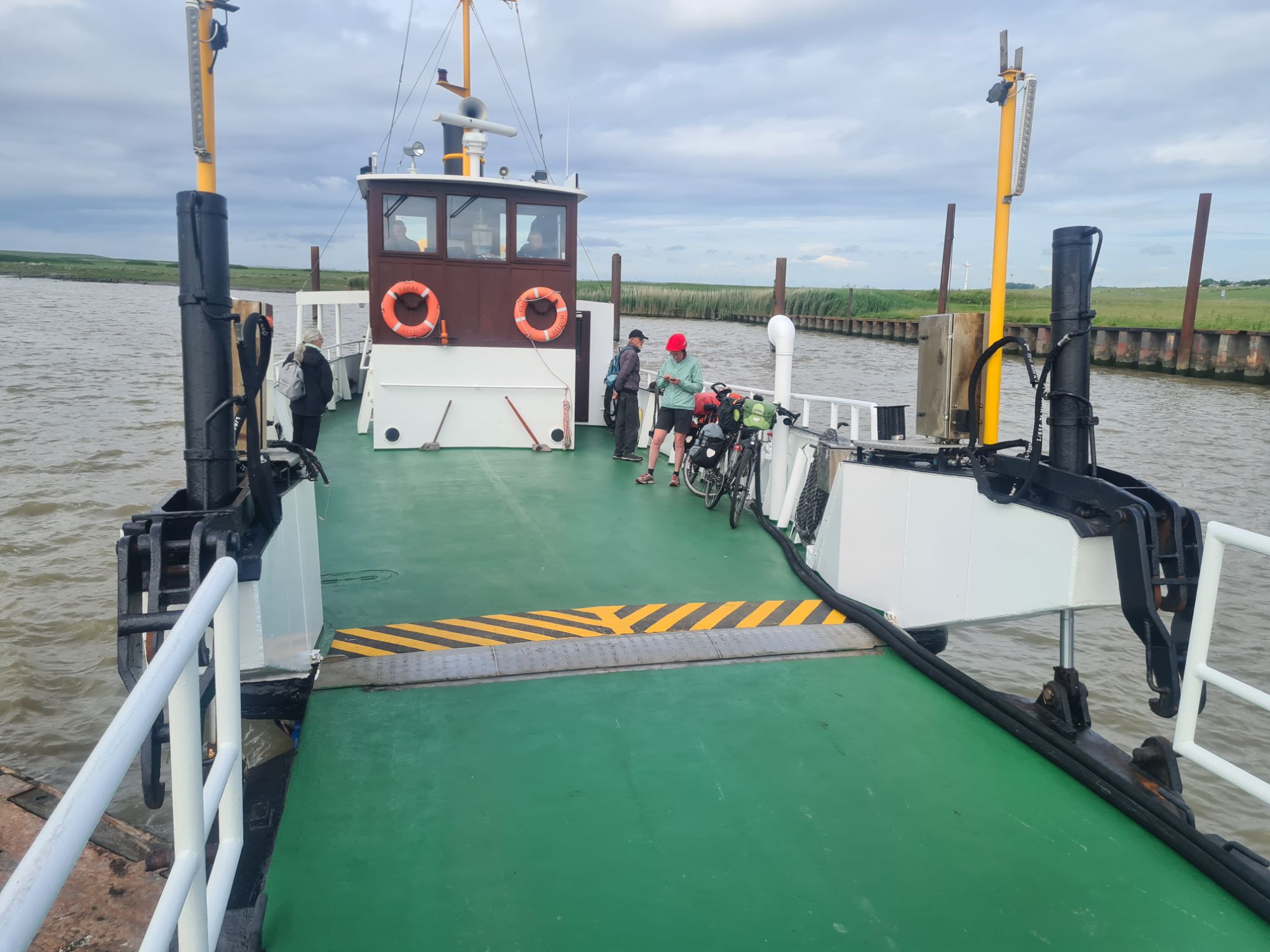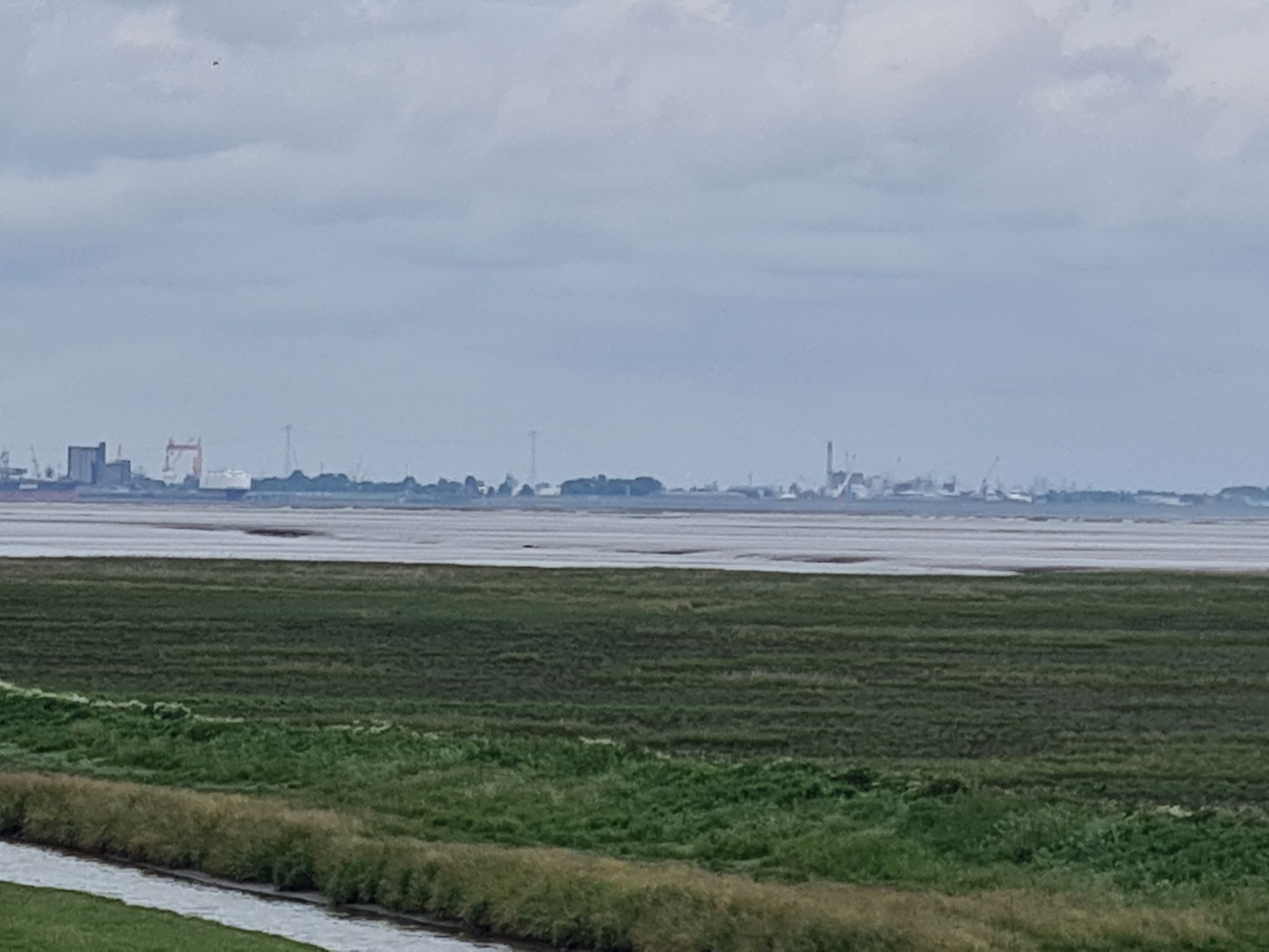 Zuerst geht es zurück zur Fähre, die uns wieder ans andere Emsufer bringtEtwas leerer als gestern…Hier sind wir an der deutsch-niederländischen Grenze….…. ein Bein in D, das andere in NL. Axs Rad steht in D, Nis in NLTypisch für die Nordseeküste: Meer, Deich, Weg, GewässerUnd Schafe, glotzendBlick zurück über den Dollard nach Emdensuperschönes kleines Café „Teetied“ in Termunterzijl – der Kuchen war echt köstlich!!Wir wandeln den Track ein wenig ab, da wir gerne dicht am Wasser und weit weg von Straßen fahren wollen. Hat auch 10km gespart… Hier sind wir in einem Industriegebiet, wo es an vielen Stellen dampft und komisch riecht – etwas gruselig!Solche Monstren stehen da…Sieht etwas gewittrig aus….… ist jedenfalls ziemlich naß! Die Mischung aus Wind, Regen und Kälte ist definitiv unattraktiv! Zum Glück regnet es erst auf den letzten Kilometern…TrocknungUnser Zimmer von außen, 2 Dachfenster und zwei Fenster mit Schlagläden