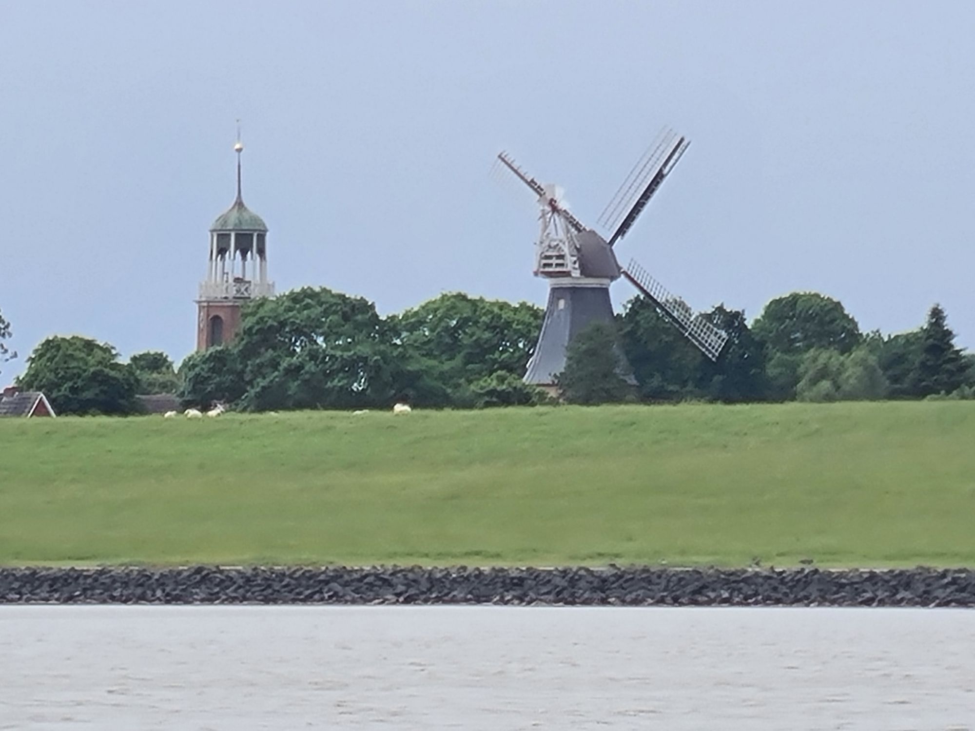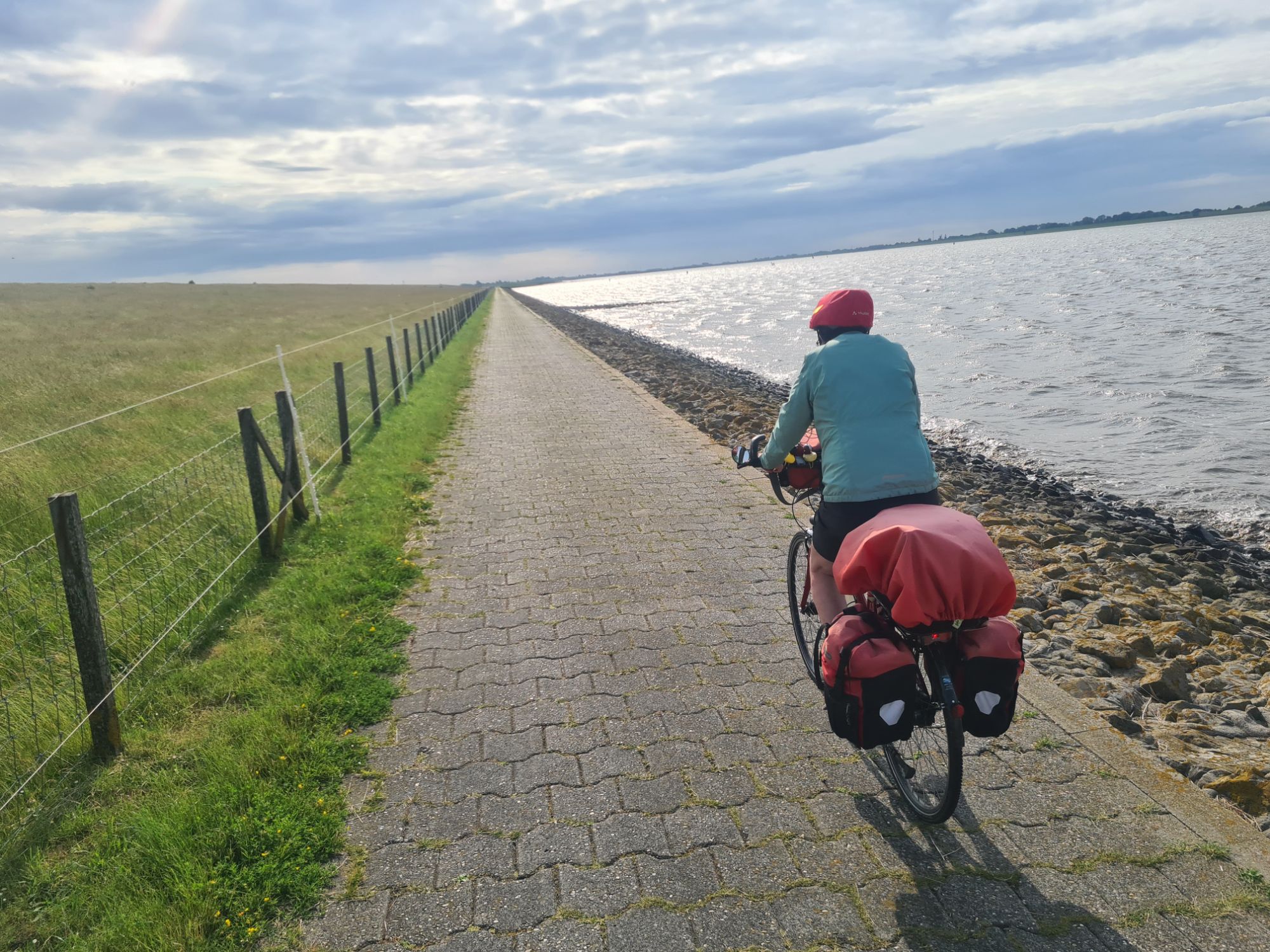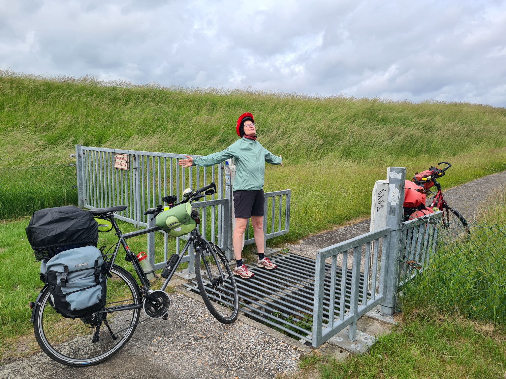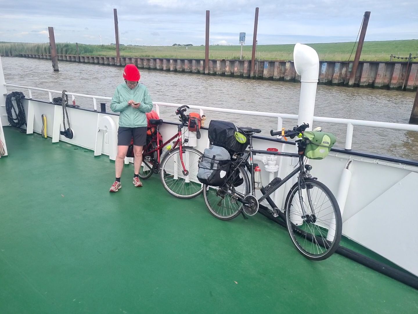 Zuerst geht es zurück zur Fähre, die uns wieder ans andere Emsufer bringtEtwas leerer als gestern…Hier sind wir an der deutsch-niederländischen Grenze….…. ein Bein in D, das andere in NL. Axs Rad steht in D, Nis in NLTypisch für die Nordseeküste: Meer, Deich, Weg, GewässerUnd Schafe, glotzendBlick zurück über den Dollard nach Emdensuperschönes kleines Café „Teetied“ in Termunterzijl – der Kuchen war echt köstlich!!Wir wandeln den Track ein wenig ab, da wir gerne dicht am Wasser und weit weg von Straßen fahren wollen. Hat auch 10km gespart… Hier sind wir in einem Industriegebiet, wo es an vielen Stellen dampft und komisch riecht – etwas gruselig!Solche Monstren stehen da…Sieht etwas gewittrig aus….… ist jedenfalls ziemlich naß! Die Mischung aus Wind, Regen und Kälte ist definitiv unattraktiv! Zum Glück regnet es erst auf den letzten Kilometern…TrocknungUnser Zimmer von außen, 2 Dachfenster und zwei Fenster mit Schlagläden