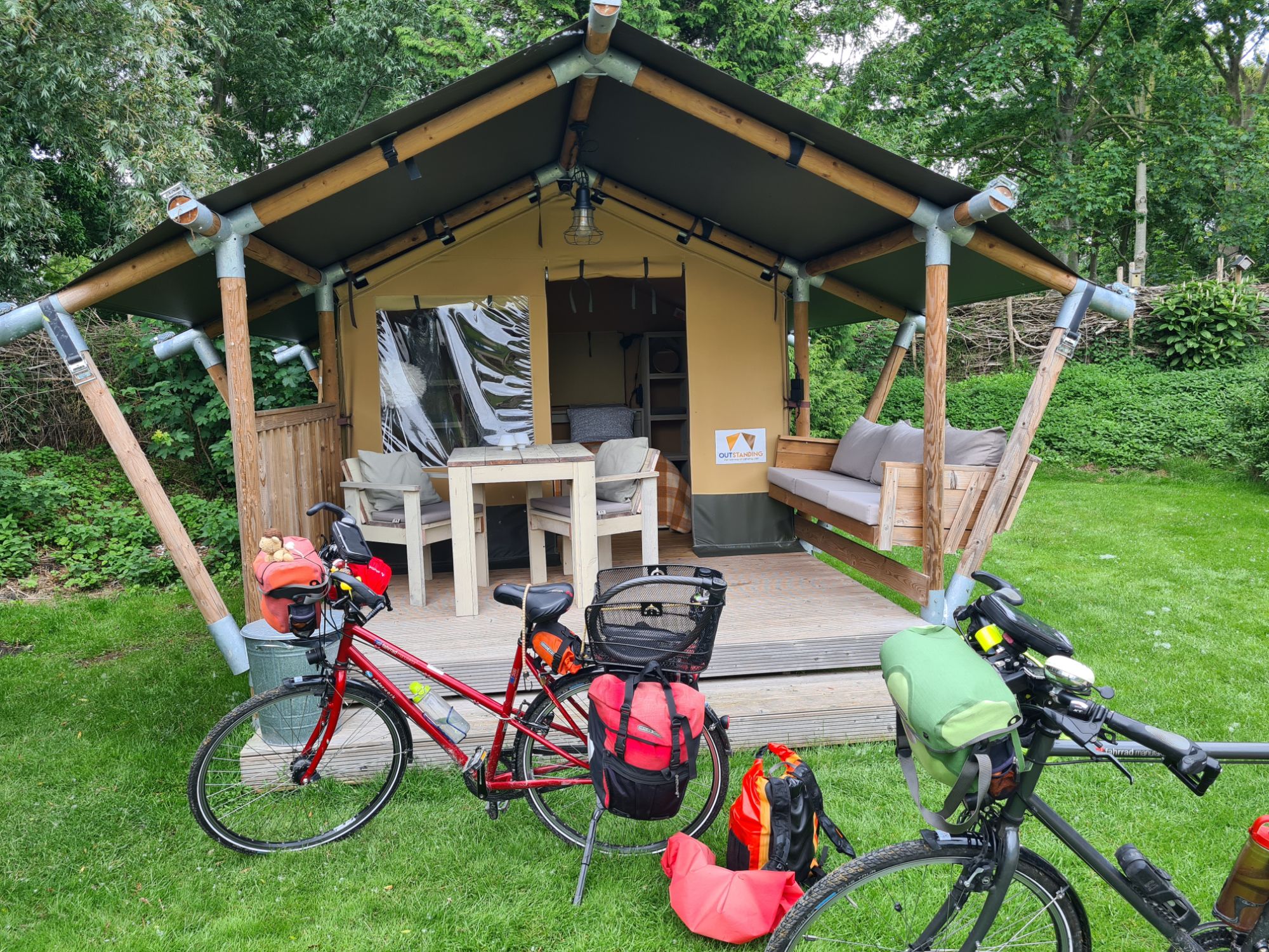 Wir genießen den verregneten Abend dick angezogen und in ne Decke eingepummelt auf der Terrasse unseres Zeltes!