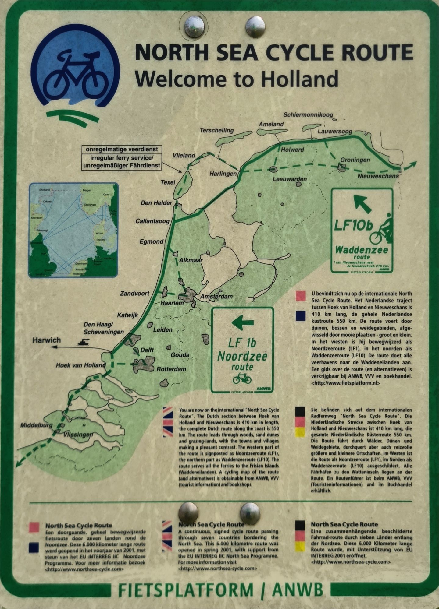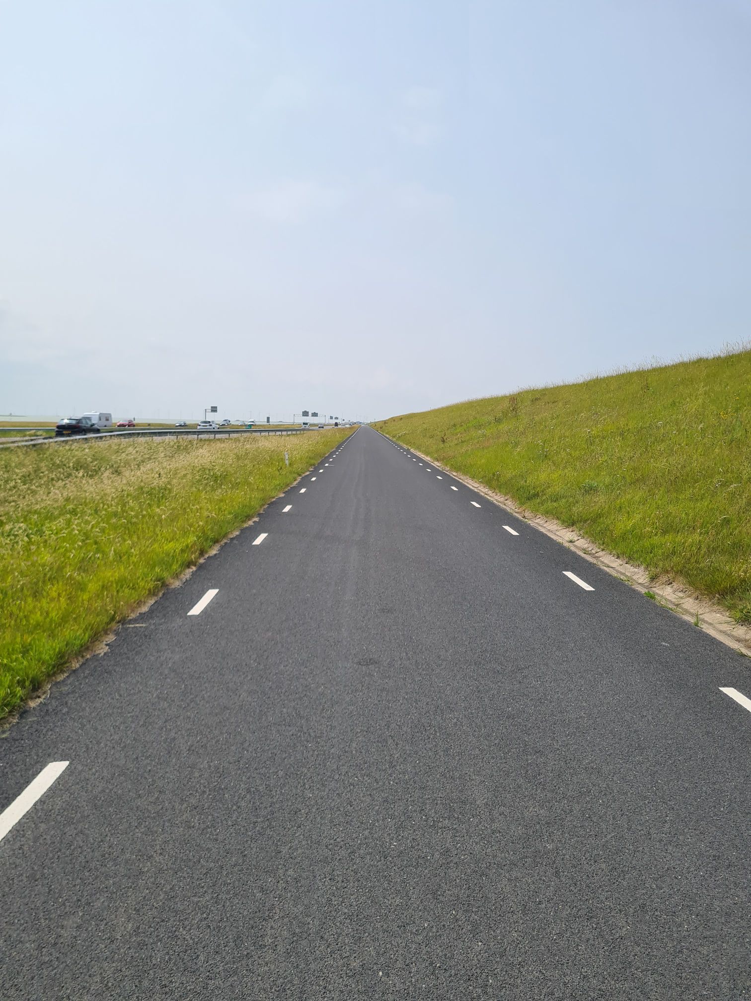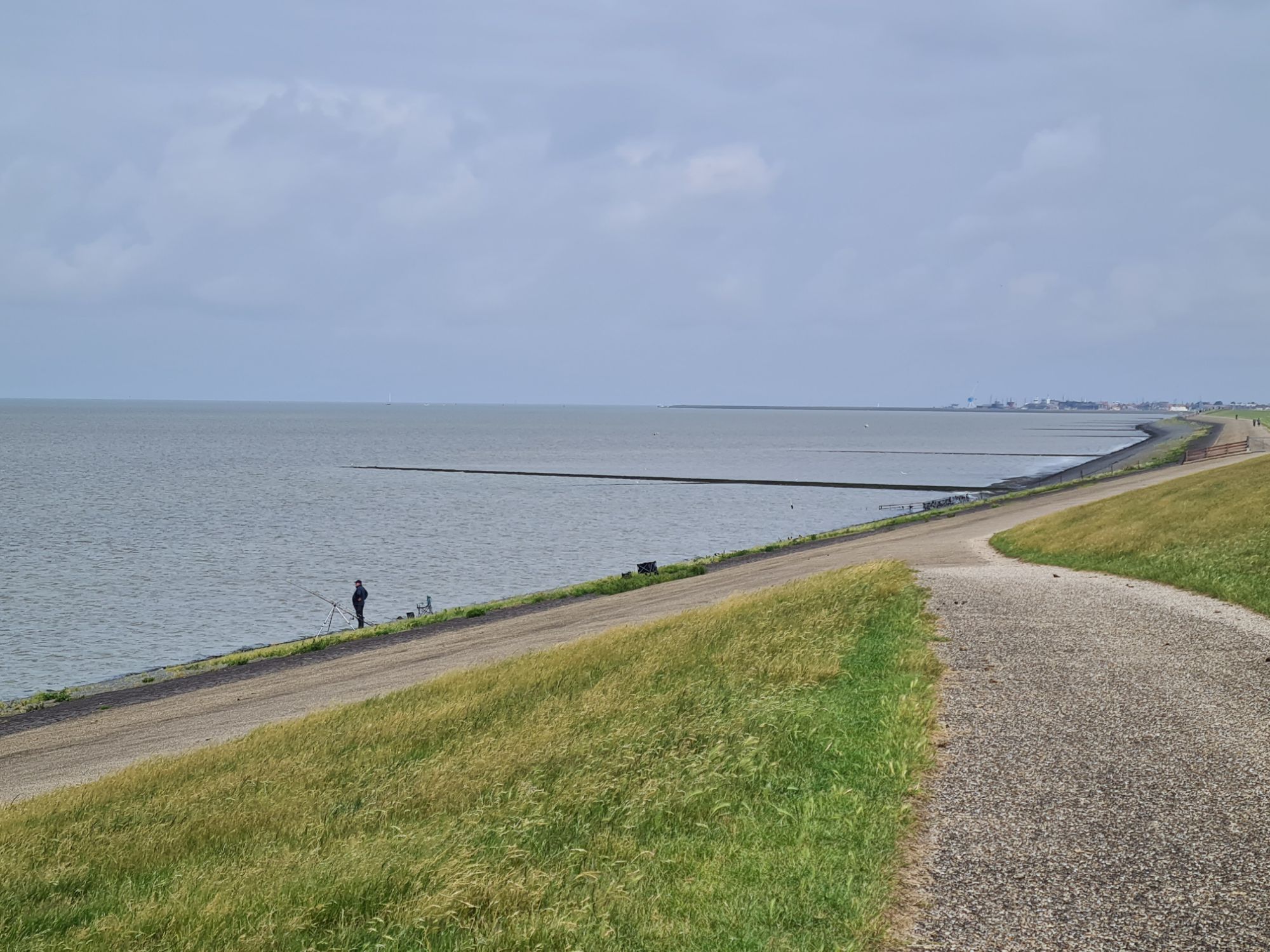 Start bei Sonnenschein! War auch etwa die Hälfte der Zeit zu sehen, allerdings wieder mit kräftigem GegenwindWiese, Deich, Himmel Hafen von Harlingen The Grand Café Hotel Zeezicht in Harlingen….… mit hochgeklappter Brücke Fähre nach TerschellingIn Harlingen und auf dem Deich kamen uns unzählige Motorradfahrer entgegen, es ließ sich leider nicht rausfinden, ob das irgendeine besondere Veranstaltung war. Dem Fietselfstedentocht – 15000 Radfahrer fahren heute 235km durch Friedland – sind wir aber nicht begegnet.Wir sind ein paar Kilometer unten am Meer geradelt, allerdings mit steifem Gegenwind – hier haben wir aufgegeben und uns hinter den Deich begeben, wo ETWAS weniger Wind war.Wiese, Deich, MeerUnser WegHier befinden wir uns geradeAm Start des Weges über den Damm zwischen Nordsee und Ijsselmeer Geradeaus, 26km, natürlich: Gegenwind.Etwas Abwechslung: eine Kurve.Hoppla, Baustelle, Sperrung, hier geht’s für Radler nicht weiter