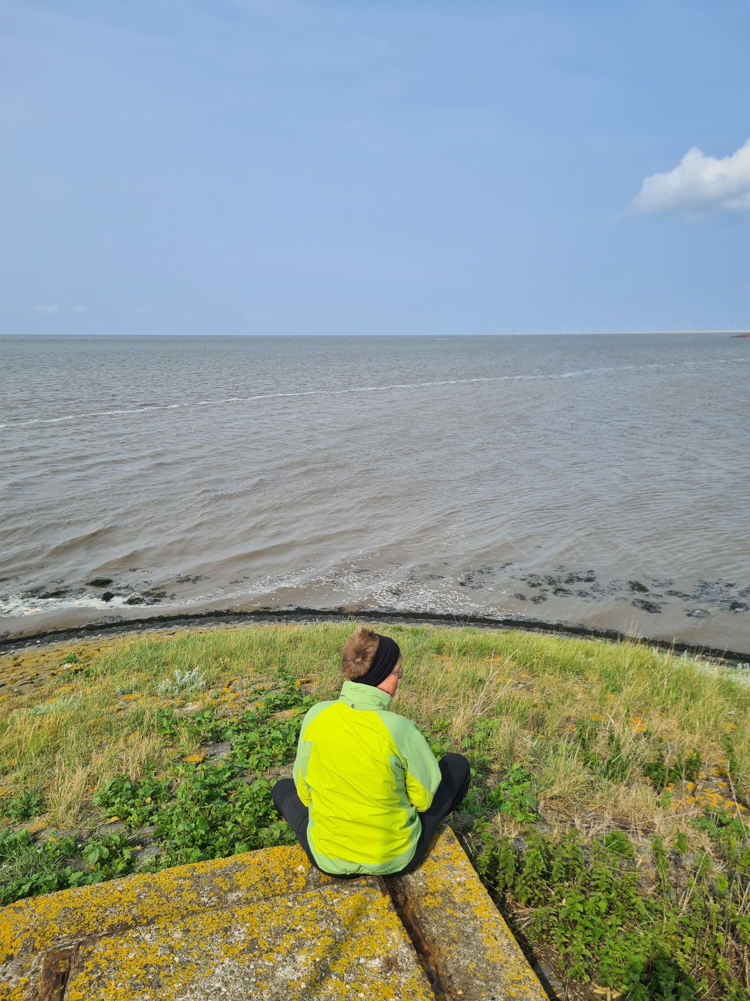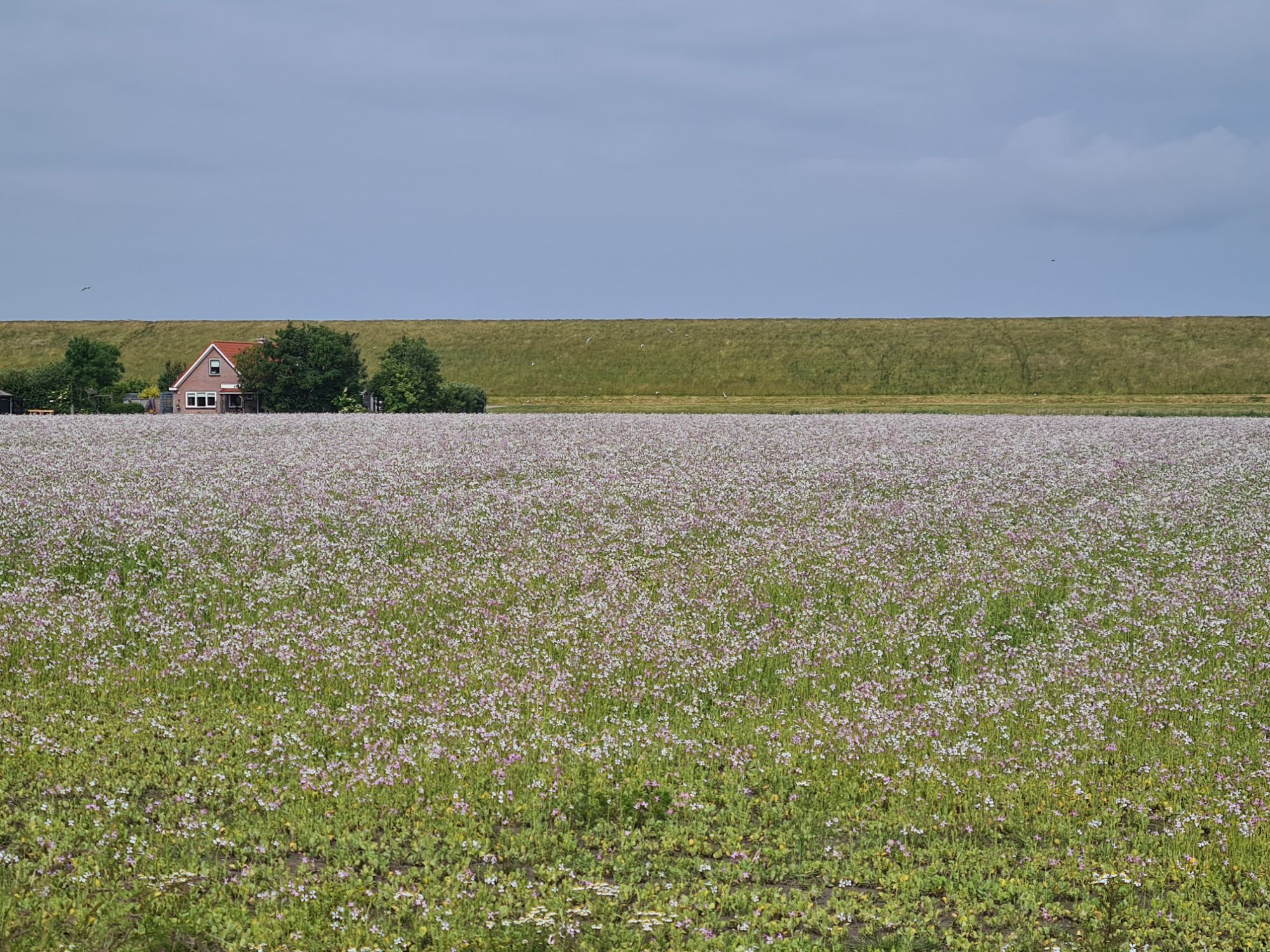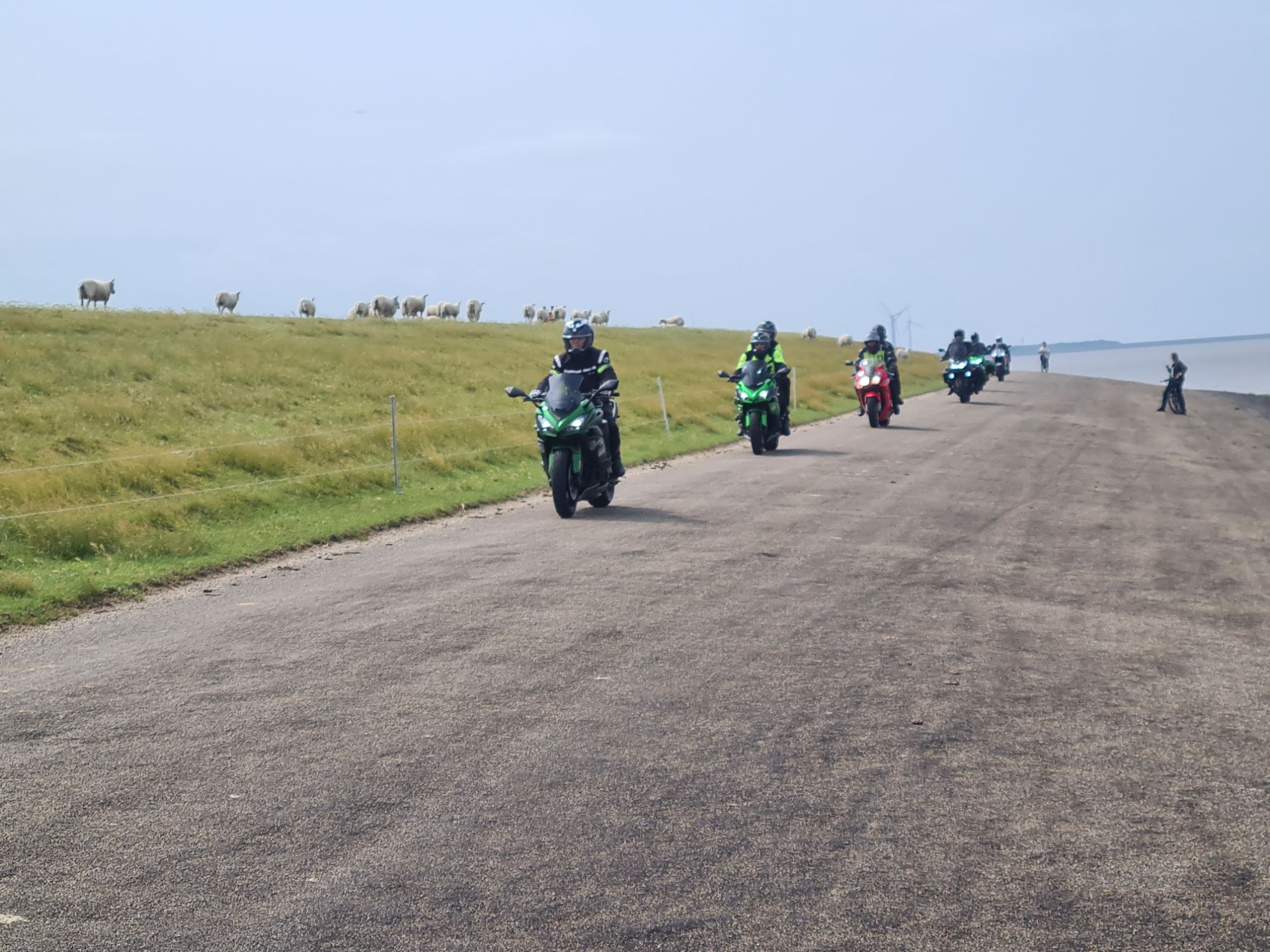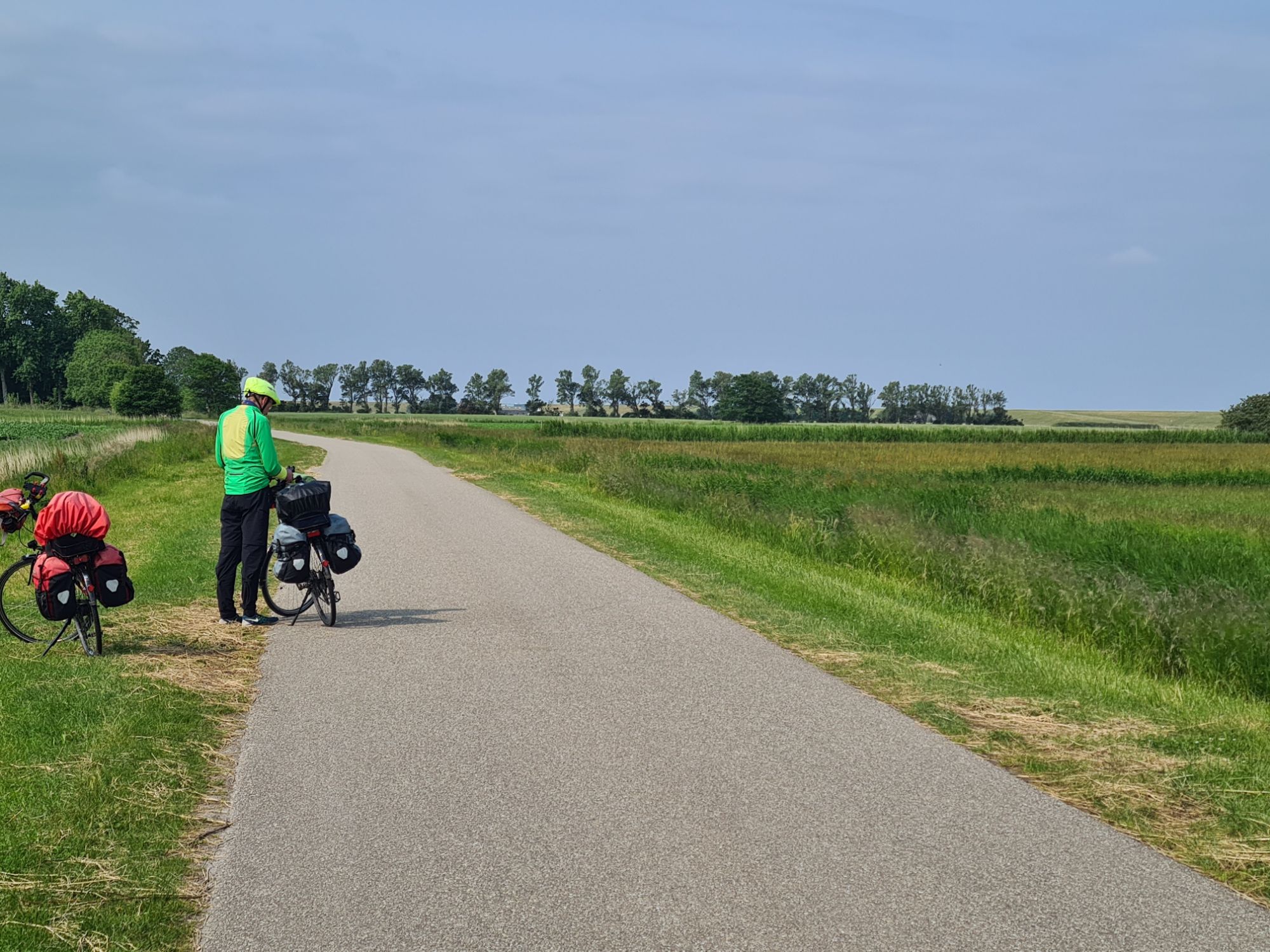 Start bei Sonnenschein! War auch etwa die Hälfte der Zeit zu sehen, allerdings wieder mit kräftigem GegenwindWiese, Deich, Himmel Hafen von Harlingen The Grand Café Hotel Zeezicht in Harlingen….… mit hochgeklappter Brücke Fähre nach TerschellingIn Harlingen und auf dem Deich kamen uns unzählige Motorradfahrer entgegen, es ließ sich leider nicht rausfinden, ob das irgendeine besondere Veranstaltung war. Dem Fietselfstedentocht – 15000 Radfahrer fahren heute 235km durch Friedland – sind wir aber nicht begegnet.Wir sind ein paar Kilometer unten am Meer geradelt, allerdings mit steifem Gegenwind – hier haben wir aufgegeben und uns hinter den Deich begeben, wo ETWAS weniger Wind war.Wiese, Deich, MeerUnser WegHier befinden wir uns geradeAm Start des Weges über den Damm zwischen Nordsee und Ijsselmeer Geradeaus, 26km, natürlich: Gegenwind.Etwas Abwechslung: eine Kurve.Hoppla, Baustelle, Sperrung, hier geht’s für Radler nicht weiter