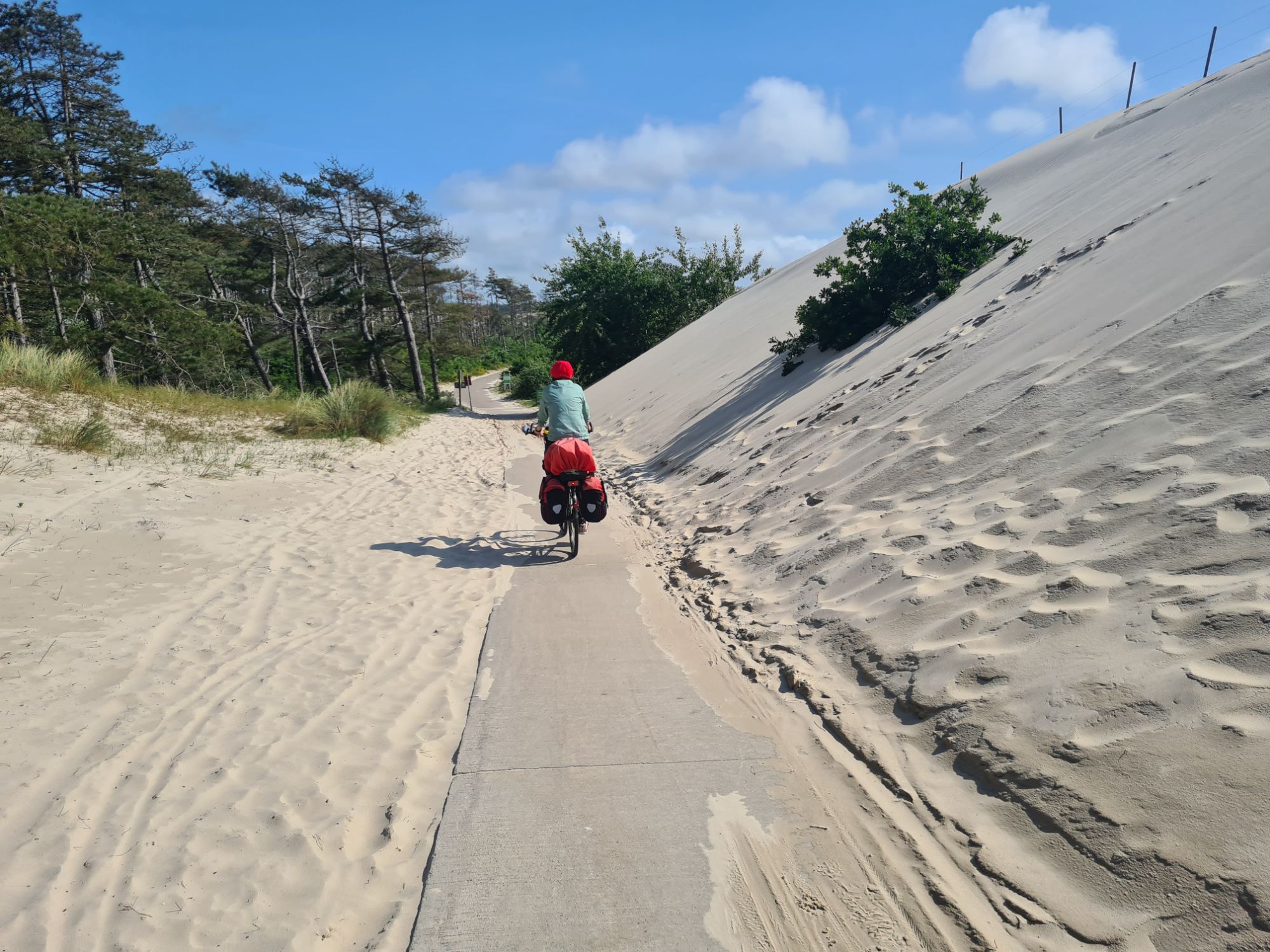 Fazit: Ein megaanstrengender Tag! Ni hat gar keine Kraft mehr in den Armen, weil sie das Rad so doll festhalten musste, oder sich am Rad, wer weiß! Unterm Strich gut, daß die Bahn nicht gefahren ist, sonst hätten wir die Dünenlandschaft verpasst…