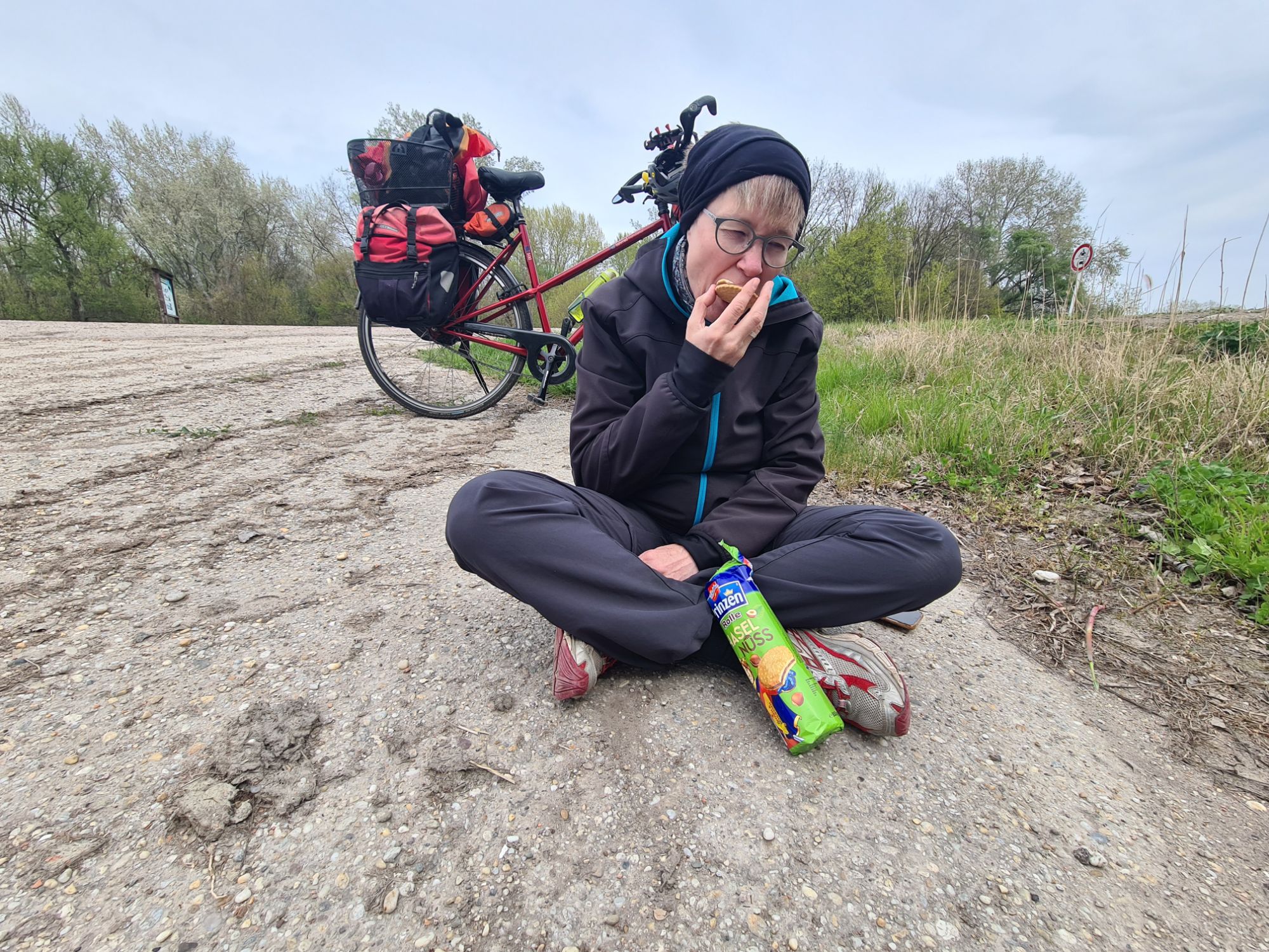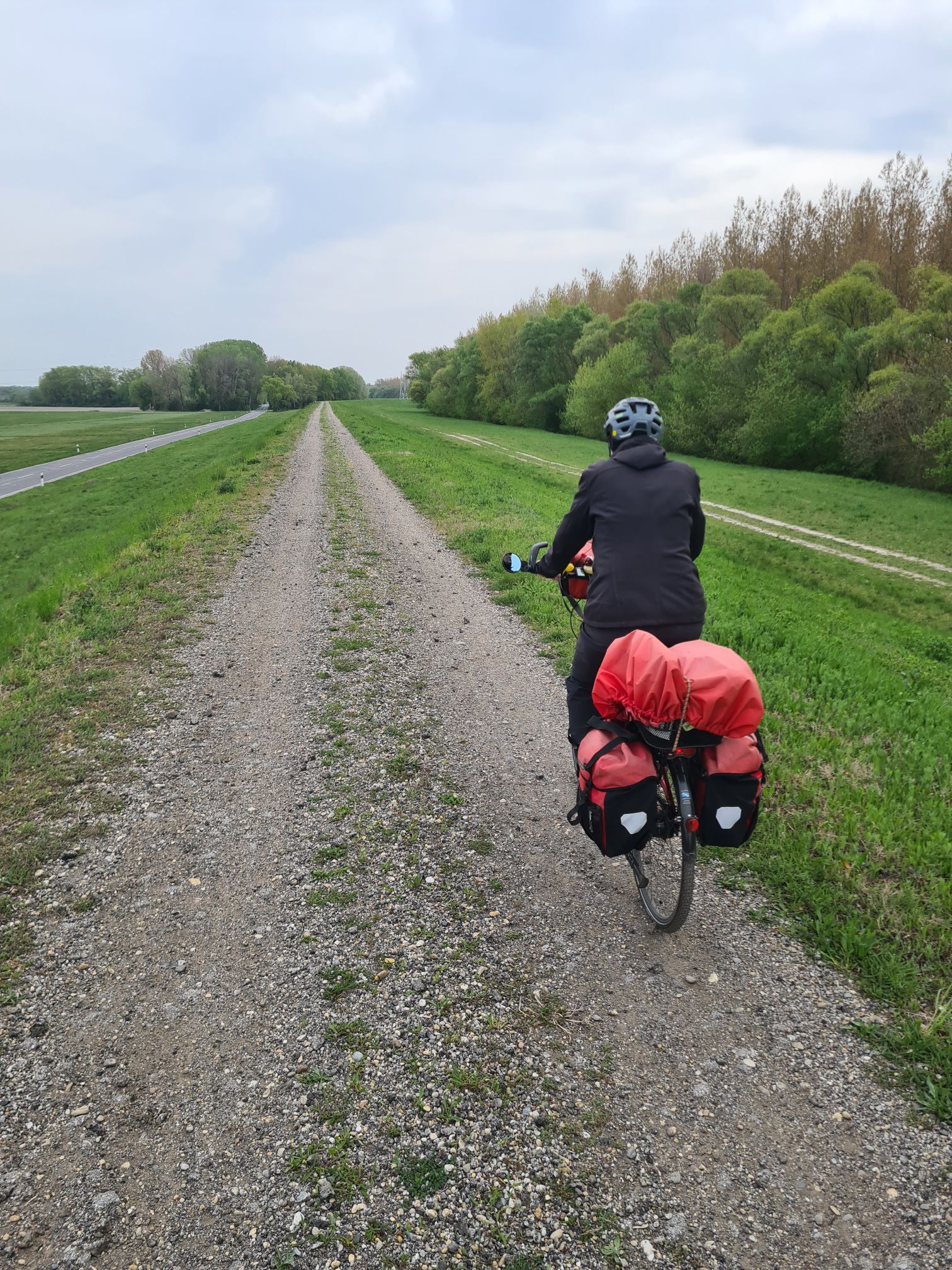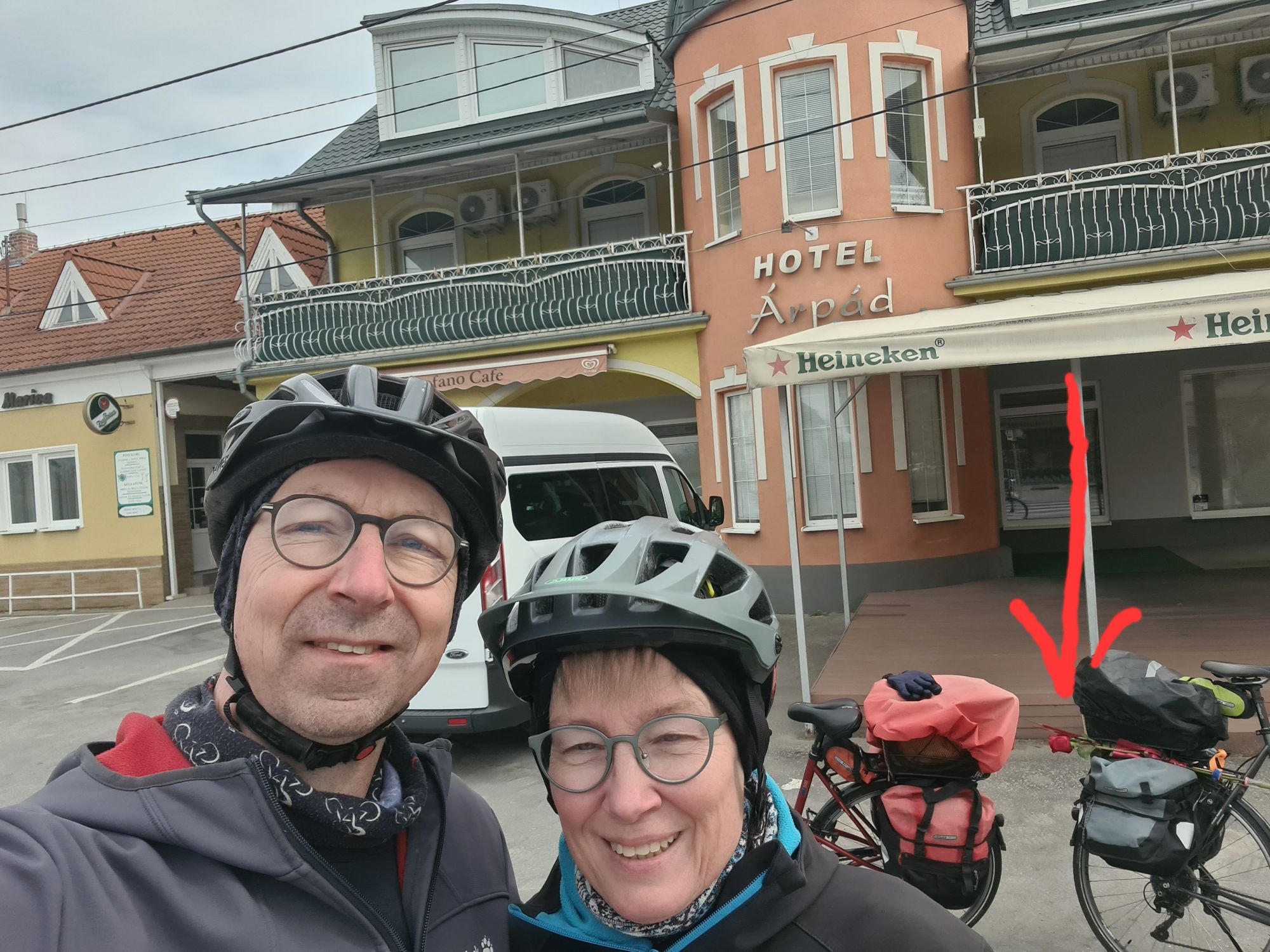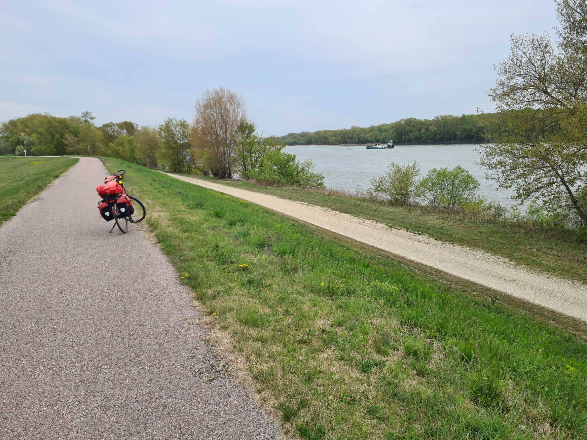 Rose und Geschenke. Zusätzlich: von der Wirtin ein Küchlein und ein Ständchen.Rose, gut geschützt und sogar mit kleinem WasservorratHier fließen Donau und Donaukanal zusammen. Am Ufer gegenüber ist schon Ungarn, die Grenze verläuft ab hier mitten im Fluß.Zwischendurch: zum Gegenwind kommt Schotterpiste dazu. Vorteil: wenn man noch langsamer fahren muss, ist der Gegenwind schwächer…Absperrung mit Fußgänger- und Radlerdurchlaß……mit kleiner RampePause, verdient.Hafen KomarnoSchönes altes Haus in Komarno, nicht so ganz vertrauenserweckendDinner mit Aussicht.Kleiner Nachtisch, megalecker!