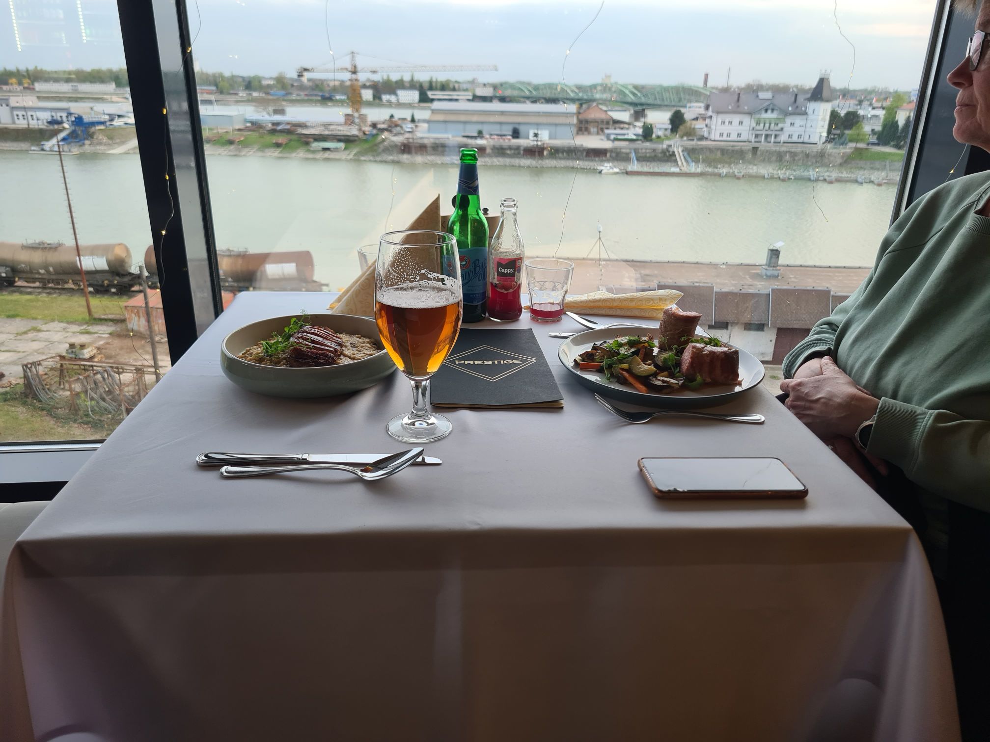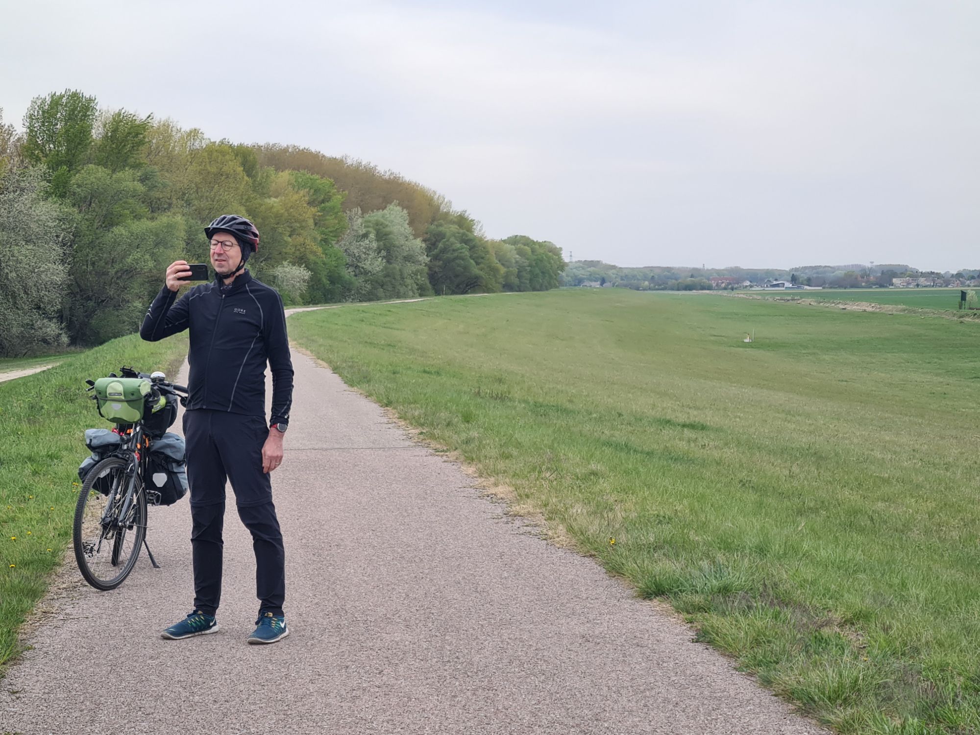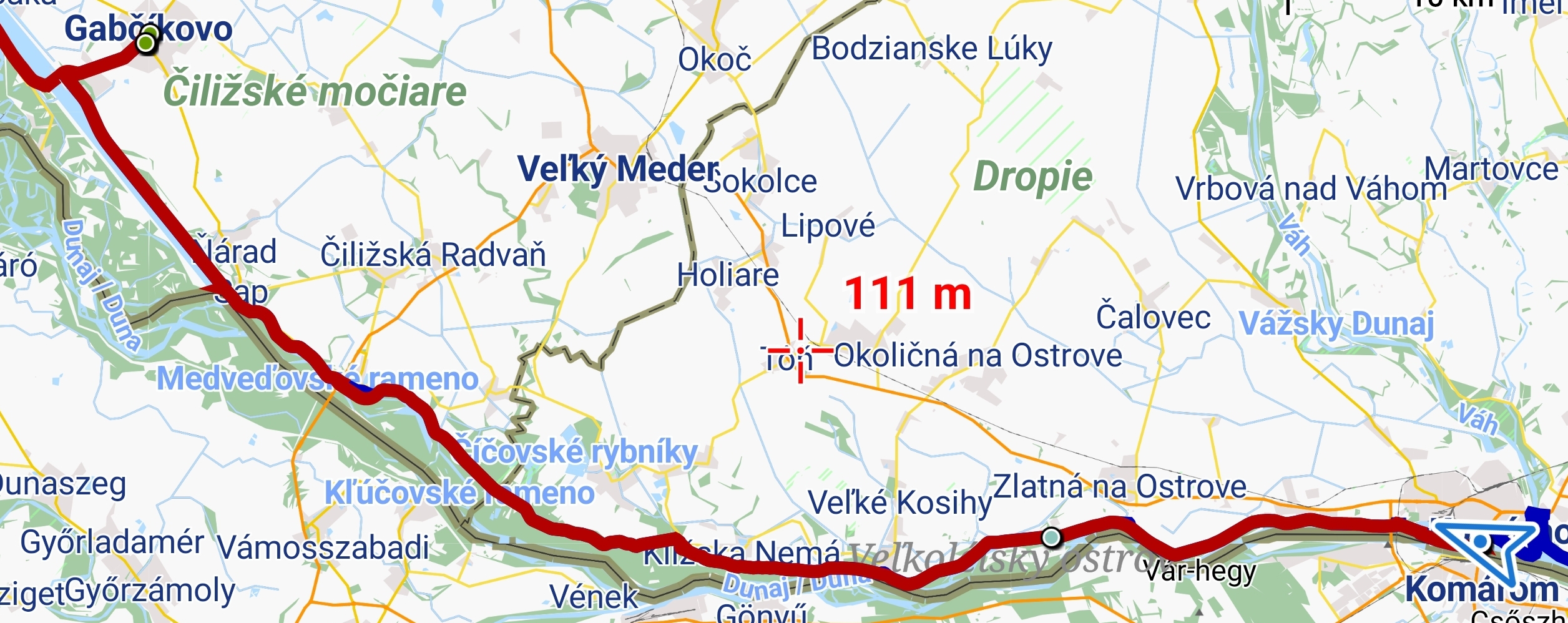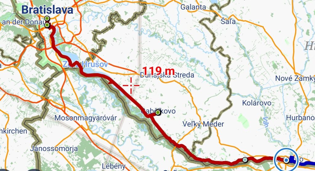 Rose und Geschenke. Zusätzlich: von der Wirtin ein Küchlein und ein Ständchen.Rose, gut geschützt und sogar mit kleinem WasservorratHier fließen Donau und Donaukanal zusammen. Am Ufer gegenüber ist schon Ungarn, die Grenze verläuft ab hier mitten im Fluß.Zwischendurch: zum Gegenwind kommt Schotterpiste dazu. Vorteil: wenn man noch langsamer fahren muss, ist der Gegenwind schwächer…Absperrung mit Fußgänger- und Radlerdurchlaß……mit kleiner RampePause, verdient.Hafen KomarnoSchönes altes Haus in Komarno, nicht so ganz vertrauenserweckendDinner mit Aussicht.Kleiner Nachtisch, megalecker!