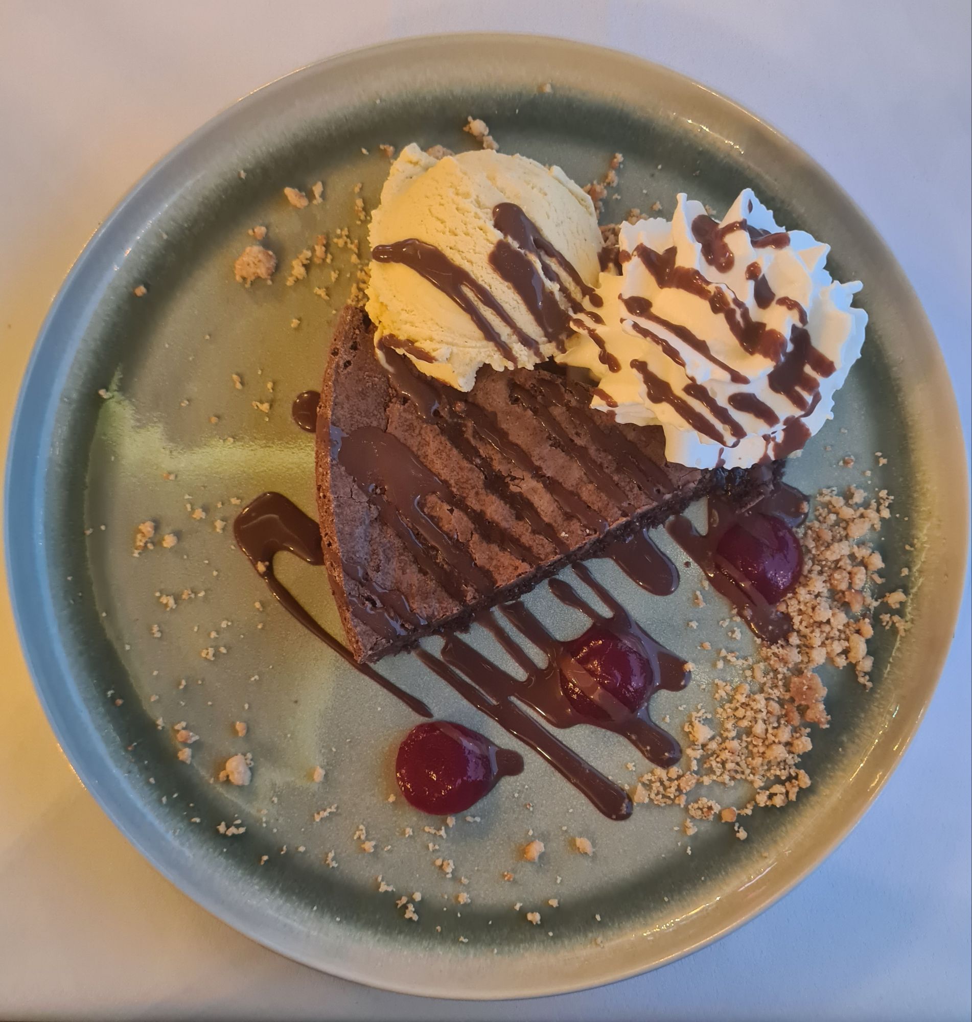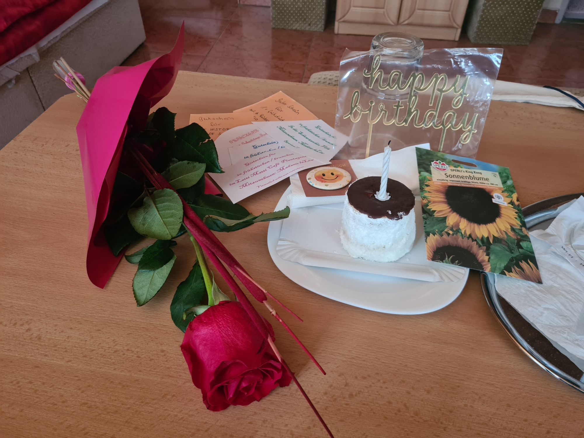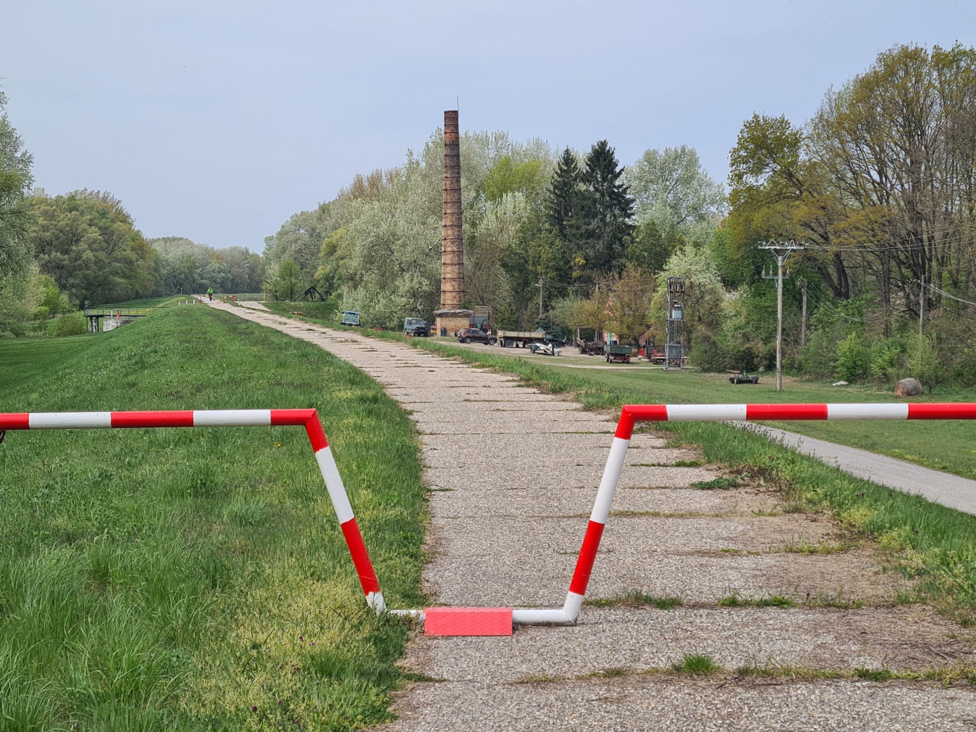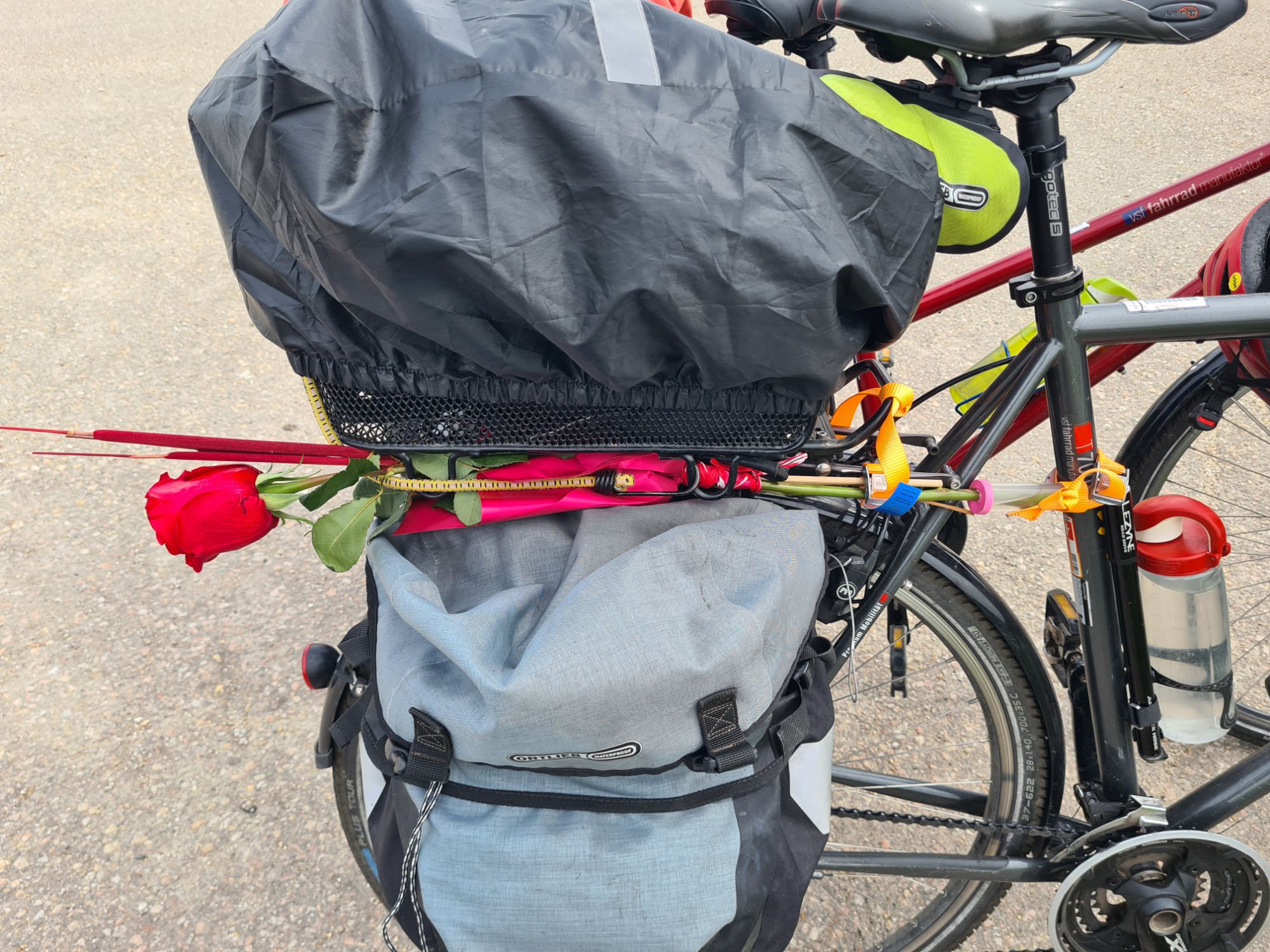 Rose und Geschenke. Zusätzlich: von der Wirtin ein Küchlein und ein Ständchen.Rose, gut geschützt und sogar mit kleinem WasservorratHier fließen Donau und Donaukanal zusammen. Am Ufer gegenüber ist schon Ungarn, die Grenze verläuft ab hier mitten im Fluß.Zwischendurch: zum Gegenwind kommt Schotterpiste dazu. Vorteil: wenn man noch langsamer fahren muss, ist der Gegenwind schwächer…Absperrung mit Fußgänger- und Radlerdurchlaß……mit kleiner RampePause, verdient.Hafen KomarnoSchönes altes Haus in Komarno, nicht so ganz vertrauenserweckendDinner mit Aussicht.Kleiner Nachtisch, megalecker!